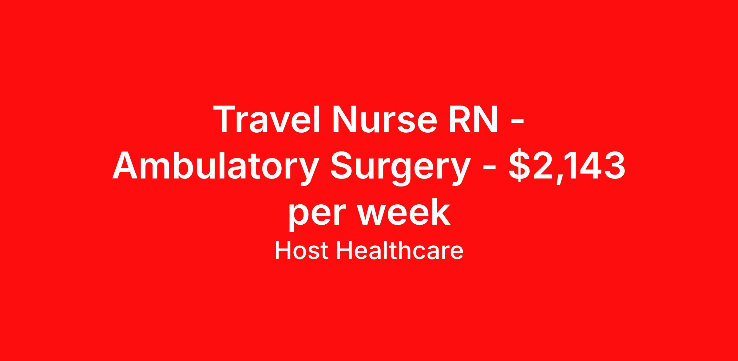 Host Healthcare is seeking a travel nurse RN Ambulatory Surgery for a travel nursing job in Tucson, Arizona. Job Description & Requirements Specialty: Ambulatory Surgery Discipline: RN Start Date: 04/13/2026 Duration: 13 weeks 40 hours per week Shift: 9 hours, days Employment Type: Travel Host Healthcare Job ID a1fVX000002z05BYAQ. Pay package is based on 9 hour shifts and 40 hours per week (subject to confirmation) with tax-free stipend amount to be determined. Posted job title: RN - Ambulatory Surgery About Host Healthcare At Host Healthcare, we provide a truly comfortable experience as you explore your travel nursing, therapy, or allied career. We make your travel healthcare journey easy by taking care of all the details, so you don’t have to. We are on a mission to help others live better and we do this by helping the healers of the world be as comfortable as possible. With access to tens of thousands of travel nursing, therapy, and allied jobs in all 50 states, our responsive and friendly recruiters find your dream position based on what’s important to you. During your assignment, get access to premium benefits, including Day 1 medical that continues up to 30 days between assignments, 401K matching, travel reimbursements, dedicated housing support, and more. We also offer 24/7 support from our team and access to our on-staff clinicians so you can feel comfortable and confident throughout your entire assignment. Travel comfortably with Host Healthcare. Benefits Referral bonus School loan reimbursement Vision benefits Wellness and fitness programs Company provided housing options License and certification reimbursement Life insurance Medical benefits Mileage reimbursement Pet insurance Discount program Employee assistance programs Guaranteed Hours Health savings account Holiday Pay 401k retirement plan Continuing Education Dental benefits