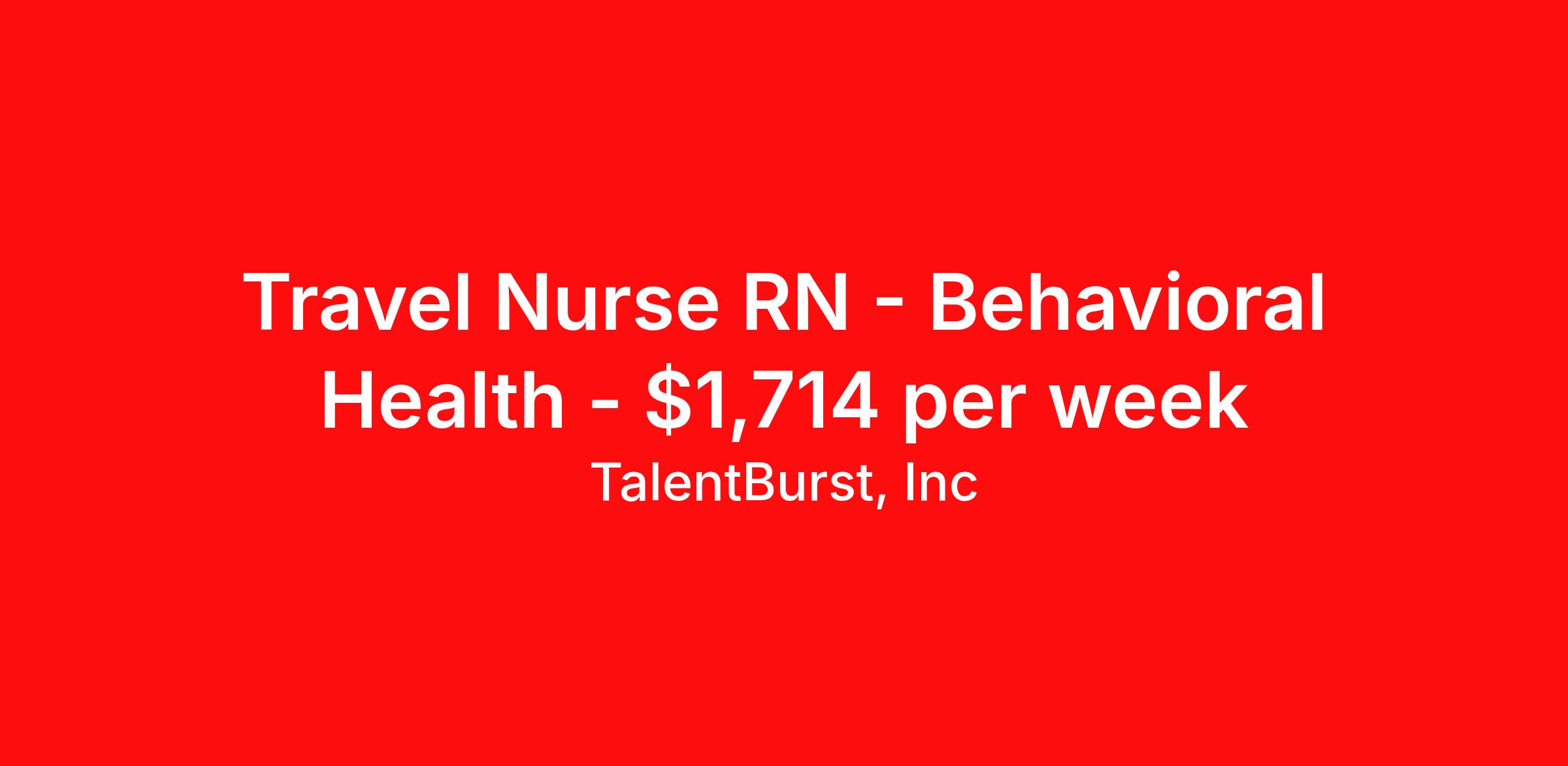 TalentBurst, Inc is seeking a travel nurse RN Behavioral Health for a travel nursing job in Houma, Louisiana. Job Description & Requirements Specialty: Behavioral Health Discipline: RN Start Date: 04/20/2026 Duration: 12 weeks 36 hours per week Shift: 12 hours, nights Employment Type: Travel Departments : Behavioral Health Unit Job Title : RN - Beh Health Specialty : Psychiatrics Location : Houma, LA 70363 Duration : 13 weeks Shift : Night Shift 12 Hour, 7p-7a NOTE : Psychiatric Experience/CPI/BLS required Job Description : This job acts as a leader in the provision of patient care using the nursing process within the framework of the Nurse Practice Act, ANA Code for Nurses and Scope & Standards of Practice. Effectively delegates, directs and assists licensed and ancillary team members; assumes accountability for quality patient outcomes; exhibits sensitivity to cultural, ethnic and religious diversity in all interactions; maintains involvement in activities aimed toward the achievement of unit and the department's strategic goals and objectives and demonstrates professional responsibility and accountability for his/her own practice and supports the company's philosophy of nursing. Education Required - Registered nurse diploma. Preferred - Associate or bachelor's degree in nursing. Experience Required - 2 years Certifications Required - Current registered nurse (RN) license in state of practice. Current Basic Life Support (BLS) certification from the American Heart Association. Preferred -Certification in clinical specialty area. KSAs Proficiency in using computers, software, and web-based applications. Effective verbal and written communication skills and ability to present information clearly and professionally to varying levels of individuals throughout the patient care process. Excellent organizational and time management skills. Job Duties Effectively uses the nursing process in the delivery of patient care. Assesses learning needs and implement teaching strategies appropriate for the diverse needs of the patient, family and other groups or disciplines. Communicates, delegates, and manages nursing team resources (human and fiscal) properly and serves as a leader and partner on the Interdisciplinary Team. Uses data, information, and knowledge to evaluate and promote change in order to achieve optimal outcomes. Embraces concepts and behaviors that enhance customer satisfaction and employee morale and improvement in the profession of nursing. Performs other related duties as required. The employer is an Equal Opportunity Employer. All qualified applicants will receive consideration for employment without regard to race, color, religion, sex, sexual orientation, gender identity, national origin, protected veteran status, or disability status. Physical and Environmental Demands The physical essential functions of this job include (but are not limited to) the following: Frequently exerting 10 to 20 pounds of force to move objects; occasionally exerting up to 100 pounds of force. Physical demand requirements are in excess of those for sedentary work. Reasonable accommodations may be made to enable individuals with disabilities to perform the essential functions. Because the incumbent works within a healthcare setting, there may be occupational risk for exposure to hazardous medications or hazardous waste within the environments through receipt, transport, storage, preparation, dispensing, administration, cleaning and/or disposal of contaminated waste. The risk level of exposure may increase depending on the essential job duties of the role. TB_RN ZRHC Talent Burst Job ID 26-06752. Pay package is based on 12 hour shifts and 36 hours per week (subject to confirmation) with tax-free stipend amount to be determined. Posted job title: RN - Behavioral Health About TalentBurst, Inc TalentBurst Health & Life Sciences is an established provider of healthcare workforce solutions, servicing healthcare facilities across the United States for over 15 years. As a Joint Commission Certified Agency, our commitment to quality, integrity, and exceptional service has made us a trusted name in the healthcare staffing landscape. Our mission is to bridge the gap between healthcare professionals seeking fulfilling opportunities and healthcare organizations striving to maintain their high standards of care. We are committed to providing top-notch healthcare professionals with access to facilities where they can focus on delivering exceptional patient care and thrive. Whether you're a nurse, allied health professional, or administrative personnel, we have the expertise to match your skills and aspirations with the perfect placement.