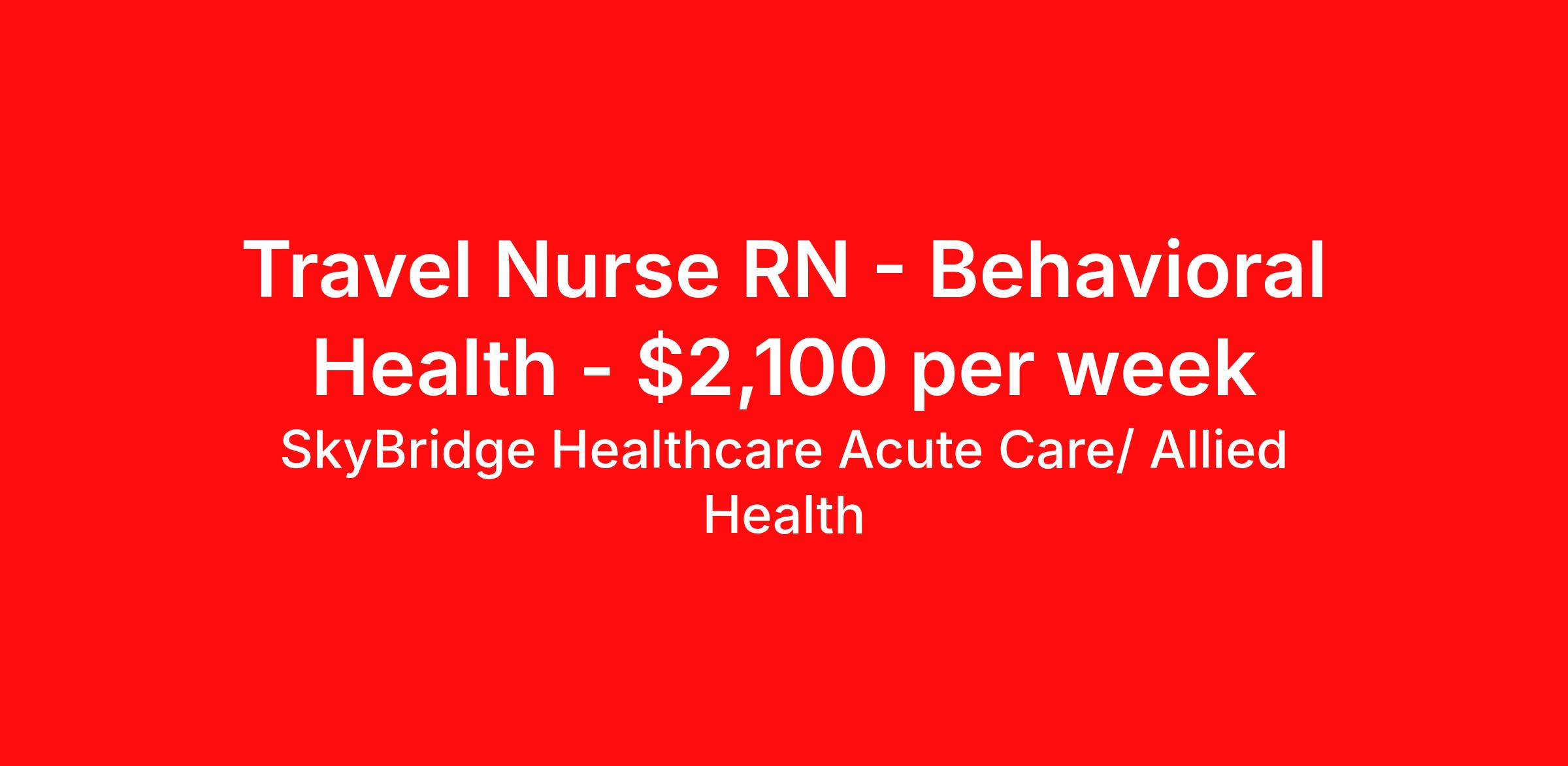 SkyBridge Healthcare Acute Care/ Allied Health is seeking a travel nurse RN Behavioral Health for a travel nursing job in Des Moines, Iowa. Job Description & Requirements Specialty: Behavioral Health Discipline: RN Duration: 13 weeks 36 hours per week Shift: 12 hours, nights Employment Type: Travel $1000 contract completion bonus after 13 weeks! SkyBridge Healthcare Acute Care/ Allied Health Job ID GK15UP. Pay package is based on 12 hour shifts and 36 hours per week (subject to confirmation) with tax-free stipend amount to be determined. About SkyBridge Healthcare Acute Care/ Allied Health It is our mission at SkyBridge Healthcare to connect professionals within the healthcare community through both genuine relationships and quality work. We understand the demands of healthcare positions which is why we want to give back to Healthcare Professionals who give so much to their communities. We’re partnered with some of the greatest facilities in the nation, therefore we ensure our Healthcare Professionals will receive top-notch treatment every step of the way. Our specialties include Nursing, Allied Health, Laboratory, Therapy, Healthcare Information Technology, and Revenue Cycle. Follow us on social media to stay in the know of our latest company updates and job postings. Benefits Weekly pay Holiday Pay Guaranteed Hours Vision benefits 401k retirement plan License and certification reimbursement Mileage reimbursement Referral bonus Employee assistance programs Medical benefits Life insurance Dental benefits Completion bonus