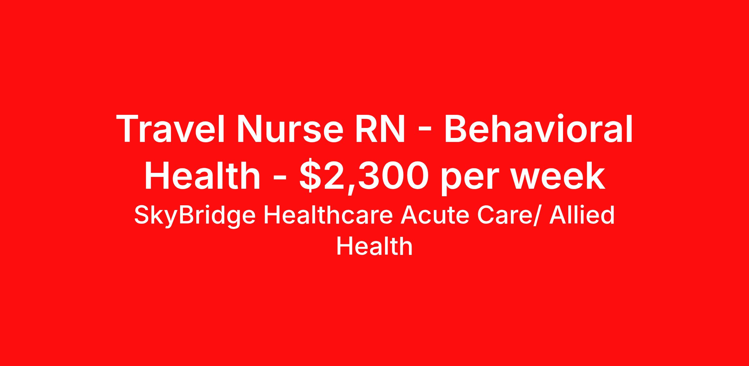 SkyBridge Healthcare Acute Care/ Allied Health is seeking a travel nurse RN Behavioral Health for a travel nursing job in Brattleboro, Vermont. Job Description & Requirements Specialty: Behavioral Health Discipline: RN Duration: 13 weeks 36 hours per week Shift: 12 hours, nights Employment Type: Travel SkyBridge Healthcare Acute Care/ Allied Health Job ID 56439KPA. Pay package is based on 12 hour shifts and 36 hours per week (subject to confirmation) with tax-free stipend amount to be determined. About SkyBridge Healthcare Acute Care/ Allied Health It is our mission at SkyBridge Healthcare to connect professionals within the healthcare community through both genuine relationships and quality work. We understand the demands of healthcare positions which is why we want to give back to Healthcare Professionals who give so much to their communities. We’re partnered with some of the greatest facilities in the nation, therefore we ensure our Healthcare Professionals will receive top-notch treatment every step of the way. Our specialties include Nursing, Allied Health, Laboratory, Therapy, Healthcare Information Technology, and Revenue Cycle. Follow us on social media to stay in the know of our latest company updates and job postings. Benefits Weekly pay Holiday Pay Guaranteed Hours Vision benefits 401k retirement plan License and certification reimbursement Mileage reimbursement Referral bonus Employee assistance programs Medical benefits Life insurance Dental benefits