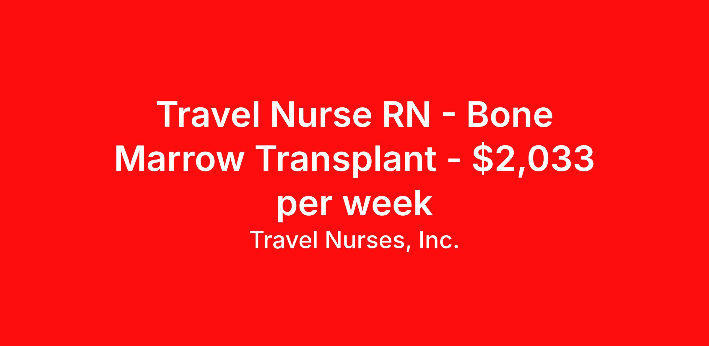 Travel Nurses, Inc. is seeking a travel nurse RN Bone Marrow Transplant for a travel nursing job in Dallas, Texas. Job Description & Requirements Specialty: Bone Marrow Transplant Discipline: RN Start Date: ASAP Duration: 13 weeks 36 hours per week Shift: 12 hours Employment Type: Travel Travel Nurses, Inc. Job ID 309494. Pay package is based on 12 hour shifts and 36 hours per week (subject to confirmation) with tax-free stipend amount to be determined. Posted job title: TRAVEL - RN BMT (694) / MC Dallas / 7P-7A About Travel Nurses, Inc. Travel Nurses, Inc. is a leading healthcare staffing agency that provides healthcare professionals with opportunities to work across the country. Founded by nurses in 1988, TNI has more than 30 years of experience in the industry. The agency initially focused on staffing operating room settings in the MidSouth. However, this quickly evolved to encompass all nursing specialties and allied health fields nationwide. At the heart of our mission is a profound respect for nurses, whom we consider the cornerstone of healthcare. This acknowledgment extends beyond the nursing profession alone. Travel Nurses, Inc. now proudly embraces a wide array of healthcare professionals, recognizing their crucial roles in our collective mission. Travel Nurses, Inc. is dedicated to providing comprehensive support and opportunities that will help facilitate complete career mobility in the healthcare field. Our commitment to transparency ensures that all professionals, not just nurses, can confidently accept any assignment without financial uncertainties. We prioritize our professionals’ well-being with comprehensive benefits packages, including day-one healthcare coverage, competitive salaries, bonuses and incentives. This underscores our unwavering commitment to offering the best possible rewards and support for all the professionals we serve. Benefits Weekly pay Continuing Education 401k retirement plan Wellness and fitness programs Mileage reimbursement Referral bonus Employee assistance programs Medical benefits Dental benefits Vision benefits Benefits start day 1 License and certification reimbursement Life insurance Retention bonus