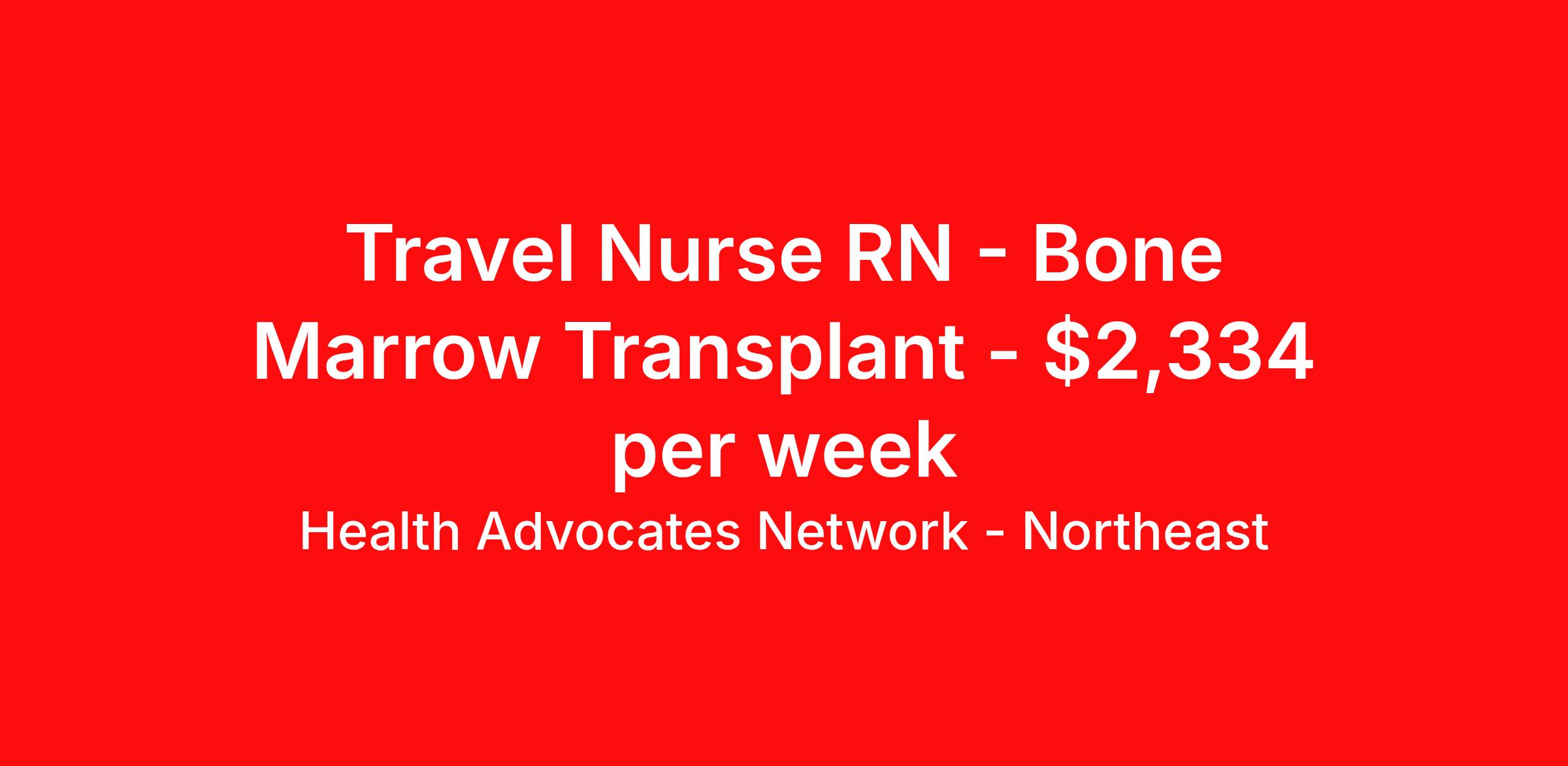 Health Advocates Network - Northeast is seeking a travel nurse RN Bone Marrow Transplant for a travel nursing job in Rochester, New York. Job Description & Requirements Specialty: Bone Marrow Transplant Discipline: RN Start Date: 04/13/2026 Duration: 12 weeks 40 hours per week Shift: 8 hours, days Employment Type: Travel HANStaff Northeast Job ID 524154. Pay package is based on 8 hour shifts and 40 hours per week (subject to confirmation) with tax-free stipend amount to be determined. Posted job title: RN - Bone Marrow Transplant About Health Advocates Network - Northeast Health Advocates Network was founded on the basis of a shared aspiration, to improve the way healthcare staffing is done. We are a company established and led by nurses. Our flexible approach enables us to develop solutions customized to your specific needs. From short- and long-term travel contracts to local and per diem assignments and more, we are here to get you to your next adventure! By solving challenges, providing the best placements, and advocating for you, we stand to help you thrive and pave the path forward in your career. Benefits 401k retirement plan