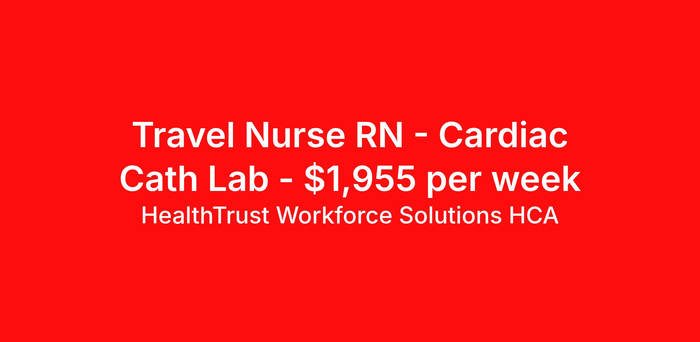 HealthTrust Workforce Solutions HCA is seeking a travel nurse RN Cardiac Cath Lab for a travel nursing job in El Paso, Texas. Job Description & Requirements Specialty: Cardiac Cath Lab Discipline: RN Start Date: 04/27/2026 Duration: 13 weeks 40 hours per week Shift: 8 hours, days Employment Type: Travel Facility Department Number: 746 Discipline: Cardiac CVT and RN Shift: 7am-3:30 Monday-Friday Call Requirements On call rotating Weekends: Yes On call General Information Tell us about the unit(s): · Number of Beds – 3 Cardiac Cath Labs 1 EP Lab 1 Hybrid Lab · Number of Staff – 1 Charge RN, 3 CL RN’s 3 CVT’s · Patient Ratios – 1:1 · Type of equipment - EMR – Meditech · Permanent Positions on Unit Avaliable? (Y/N) –Yes Must have: candidates without these skills will not be considered for the role. · Cath Lab Experience About HealthTrust Workforce Solutions HCA At HealthTrust Workforce Solutions, healthcare is not just about the four walls of a facility but about the people who provide and receive care. Our focus is on empowering healthcare professionals to deliver exceptional patient experiences by providing them with the necessary skills, tools, and support. We partner with healthcare facilities nationwide to ensure that the right professionals are in the right roles. We prioritize our clinicians by giving them a voice and access to opportunities to fulfill their mission of improving lives by providing quality patient care. We are committed to our core values of Trust, Innovation, Adaptability, Courage, and Accountability. We are dedicated to positively impacting the healthcare industry by providing first-priority access to more than 200,000 jobs nationwide to our healthcare professionals. Join us and be part of the HealthTrust family, where you can make a difference every day. We embrace our changing environment, and we maintain a culture that has a rich tradition of transforming itself to meet the challenges of the future. MISSION STATEMENT While putting great people in the right roles is essential, our mission is far greater. We want our clinicians to be part of the HealthTrust family, where healthcare professionals have a voice and are empowered with the right tools and opportunities to fulfill their personal mission of improving lives. Plus, as a preferred partner to thousands of top-performing hospitals, we provide our healthcare professionals with first-priority access to more than 200,000 jobs nationwide. Benefits Dental benefits Vision benefits Referral bonus Continuing Education Life insurance