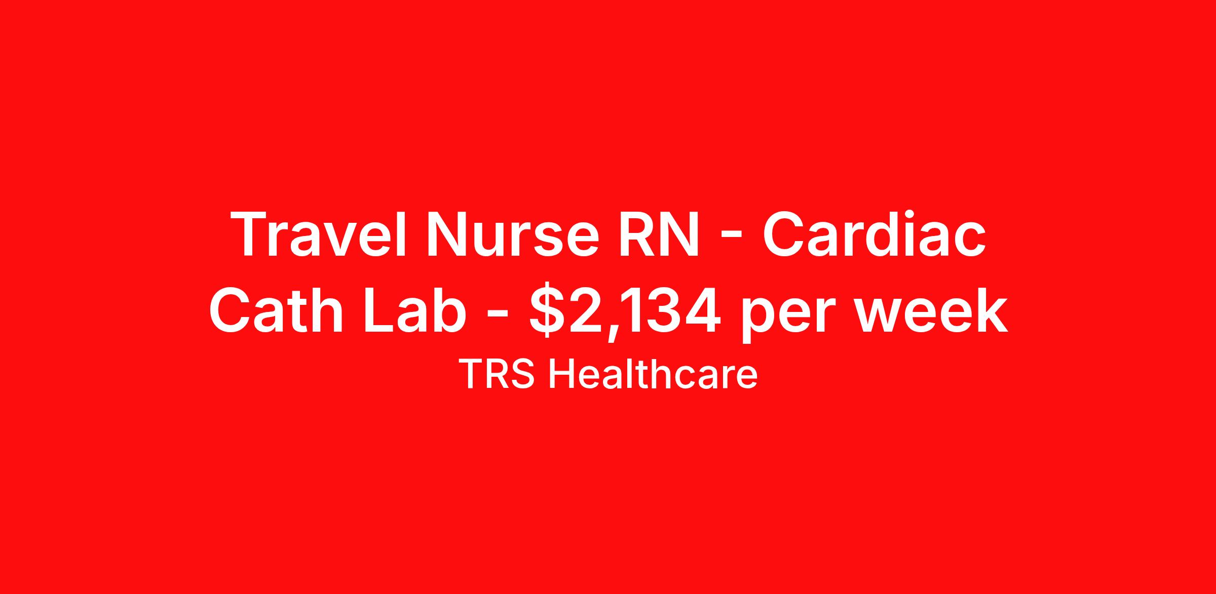 TRS Healthcare is seeking a travel nurse RN Cardiac Cath Lab for a travel nursing job in Columbia, South Carolina. Job Description & Requirements Specialty: Cardiac Cath Lab Discipline: RN Start Date: 04/13/2026 Duration: 13 weeks 40 hours per week Shift: 10 hours, days Employment Type: Travel TRS Healthcare Job ID 1444509. Pay package is based on 10 hour shifts and 40 hours per week (subject to confirmation) with tax-free stipend amount to be determined. Posted job title: Radiology - Cardiac Cath Lab Registered Nurse About TRS Healthcare TRS Healthcare has been a leader in the healthcare staffing industry for over 25 years, providing exceptional career opportunities for travel nurses and allied health professionals. An RN-founded, woman-owned company, TRS Healthcare has team members in all 50 states. We recruit and support registered nurses, licensed practical nurses, surgical technicians, respiratory therapists, imaging technologists, laboratory specialists, and other experienced nursing and allied healthcare professionals. We staff hundreds of healthcare facilities across the U.S. in urban, rural, and underserved areas, including multi-state hospital systems, critical access hospitals, rural community hospitals, long-term care facilities, trauma centers, standalone clinics, and more. Learn more about TRS Healthcare at trshealthcare.com .
