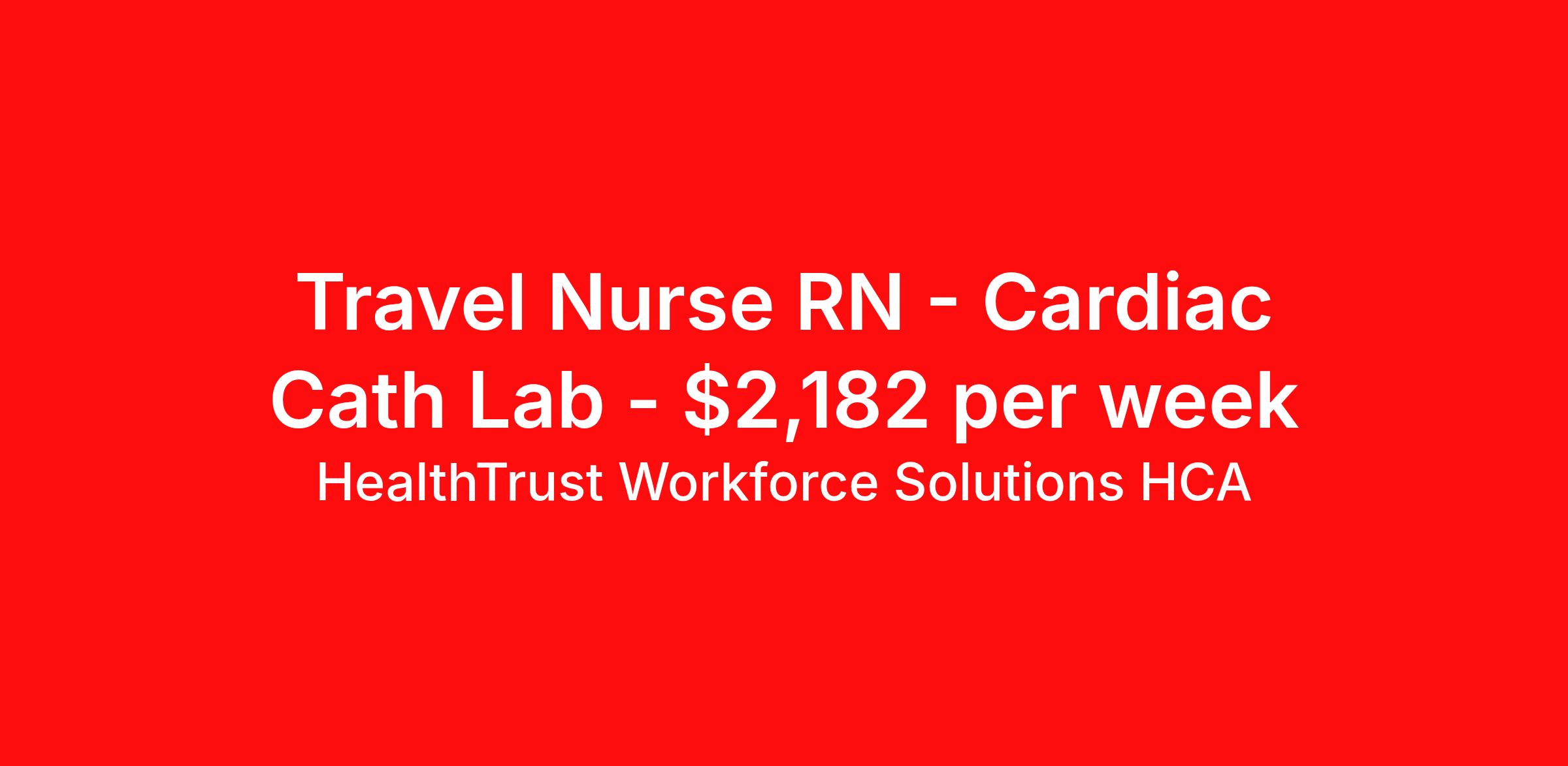 HealthTrust Workforce Solutions HCA is seeking a travel nurse RN Cardiac Cath Lab for a travel nursing job in Ocala, Florida. Job Description & Requirements Specialty: Cardiac Cath Lab Discipline: RN Start Date: 04/13/2026 Duration: 13 weeks 36 hours per week Shift: 12 hours, days Employment Type: Travel Not the right fit? No worries – I’ve got jobs all over. Text or call me, Kalee, at and let’s find somewhere that works for you. About HealthTrust Workforce Solutions HCA At HealthTrust Workforce Solutions, healthcare is not just about the four walls of a facility but about the people who provide and receive care. Our focus is on empowering healthcare professionals to deliver exceptional patient experiences by providing them with the necessary skills, tools, and support. We partner with healthcare facilities nationwide to ensure that the right professionals are in the right roles. We prioritize our clinicians by giving them a voice and access to opportunities to fulfill their mission of improving lives by providing quality patient care. We are committed to our core values of Trust, Innovation, Adaptability, Courage, and Accountability. We are dedicated to positively impacting the healthcare industry by providing first-priority access to more than 200,000 jobs nationwide to our healthcare professionals. Join us and be part of the HealthTrust family, where you can make a difference every day. We embrace our changing environment, and we maintain a culture that has a rich tradition of transforming itself to meet the challenges of the future. MISSION STATEMENT While putting great people in the right roles is essential, our mission is far greater. We want our clinicians to be part of the HealthTrust family, where healthcare professionals have a voice and are empowered with the right tools and opportunities to fulfill their personal mission of improving lives. Plus, as a preferred partner to thousands of top-performing hospitals, we provide our healthcare professionals with first-priority access to more than 200,000 jobs nationwide. Benefits Dental benefits Vision benefits Referral bonus Continuing Education Life insurance