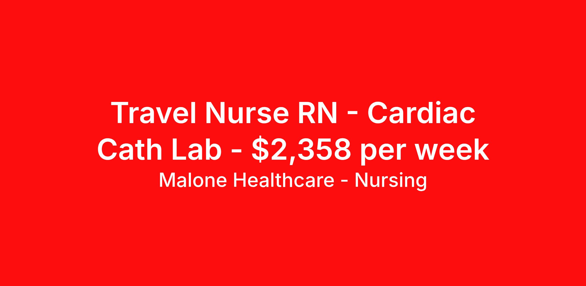 Malone Healthcare - Nursing is seeking a travel nurse RN Cardiac Cath Lab for a travel nursing job in Louisville, Kentucky. Job Description & Requirements Specialty: Cardiac Cath Lab Discipline: RN Start Date: 03/24/2026 Duration: 13 weeks 36 hours per week Shift: 12 hours, days Employment Type: Travel Job Summary – Position Information Role: RN Specialty: Cardiac Cath Lab Number of Openings: 1 Shift: 7:00 AM – 7:30 PM Weekly Guaranteed Hours: 36 Weekend Requirement: 1–2 weekends of call during a 6-week schedule Weekday Call: 6:30 PM – 7:00 AM (next day) Weekend Call: 7:00 AM Saturday – 7:00 AM Monday Required Certifications: ACLS, BLS, and KY License Required Experience: 2 years Float Requirement: EP Lab Unit Information Cath Lab Rooms: 6 Patient Ratio: 1:1 in procedure room (one case at a time) Equipment: GE X-ray Systems EMR Systems: McKesson Cardiology and Cerner Hiring Profile Must have 2 years of Cath Lab RN experience Must have McKesson experience Must have Cerner experience Must be willing to rotate and cover the UofL Cath Lab Preferred: Structural heart experience Preferred: Scrubbing experience Preferred: Monitoring experience Personality Fit: Detail-oriented Strong troubleshooting skills required Clear and concise communication skills required Ability to work in a multidisciplinary environment required About Malone Healthcare - Nursing With a commitment to providing a higher standard of service and experience in patient care, Malone Healthcare places expert nurses and allied health professionals in rewarding careers throughout the United States. As a leading healthcare staffing agency, Malone’s focus on compliance and integrity translates to a seamless experience for our team members and partner facilities. When you work with Malone Healthcare, you can rely on over 50 years of proven experience placing exceptional professionals in quality healthcare settings. Benefits Weekly pay Holiday Pay Guaranteed Hours Continuing Education 401k retirement plan Pet insurance Referral bonus Medical benefits Dental benefits Vision benefits License and certification reimbursement Life insurance