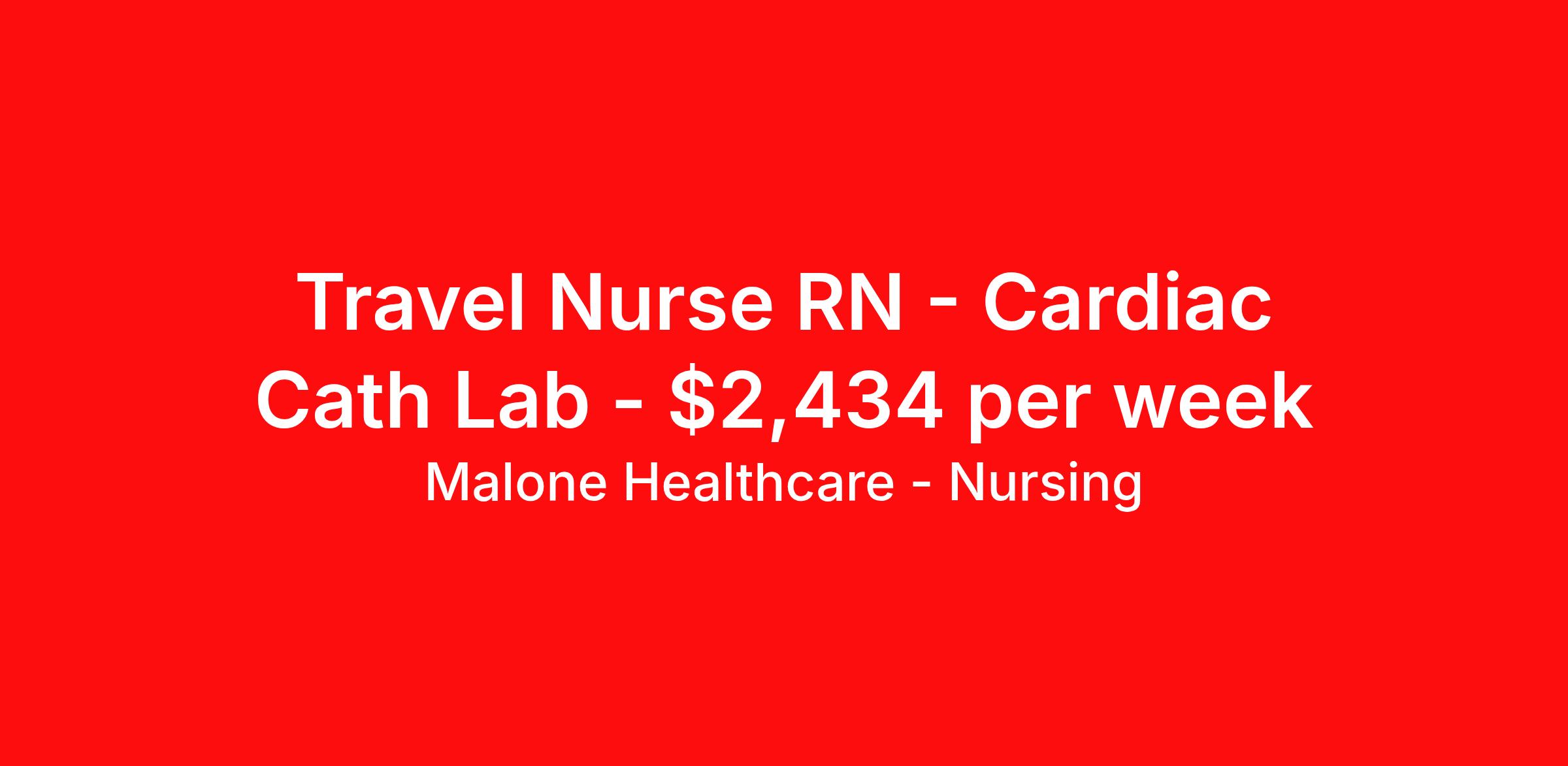 Malone Healthcare - Nursing is seeking a travel nurse RN Cardiac Cath Lab for a travel nursing job in Louisville, Kentucky. Job Description & Requirements Specialty: Cardiac Cath Lab Discipline: RN Start Date: 04/06/2026 Duration: 13 weeks 36 hours per week Shift: 12 hours, days Employment Type: Travel About Malone Healthcare - Nursing With a commitment to providing a higher standard of service and experience in patient care, Malone Healthcare places expert nurses and allied health professionals in rewarding careers throughout the United States. As a leading healthcare staffing agency, Malone’s focus on compliance and integrity translates to a seamless experience for our team members and partner facilities. When you work with Malone Healthcare, you can rely on over 50 years of proven experience placing exceptional professionals in quality healthcare settings. Benefits Weekly pay Holiday Pay Guaranteed Hours Continuing Education 401k retirement plan Pet insurance Referral bonus Medical benefits Dental benefits Vision benefits License and certification reimbursement Life insurance