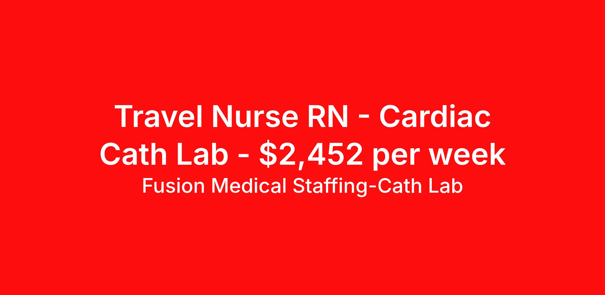 Fusion Medical Staffing-Cath Lab is seeking a travel nurse RN Cardiac Cath Lab for a travel nursing job in Springfield, Tennessee. Job Description & Requirements Specialty: Cardiac Cath Lab Discipline: RN Start Date: ASAP Duration: 13 weeks 40 hours per week Shift: 8 hours, days Employment Type: Travel Travel Cath Lab RN Company: Fusion Medical Staffing Location: Facility in Springfield, Tennessee Job Details Fusion Medical Staffing is seeking a skilled Cardiac Cath Lab RN for a 13-week travel assignment in Springfield, Tennessee. As a member of our team, you'll have the opportunity to make a positive impact on the lives of patients while enjoying competitive pay, comprehensive benefits, and the support of a dedicated clinical team. Required Qualifications: One year’s recent experience as a Cath Lab RN Valid RN license in compliance with state regulations Current BLS (AHA/ ARC) Certification Current ACLS Certification Preferred Qualifications: PALS or ENPC Certifications RCIS certification Other certifications and licenses may be required for this position Summary: The Travel Cath Lab RN provides specialized care for patients undergoing cardiac catheterization and interventional treatments. The RN prepares patients for procedures, assists during interventions, and monitors immediate post-procedure recovery. Working closely with cardiologists and cath lab teams, this role requires advanced cardiac care skills, cardiac catheterization skills, strong communication, and the ability to adapt quickly while maintaining strict safety and regulatory standards. Essential Work Functions: Conduct assessment of patients prior to procedures, including reviewing medical history and performing physical exams Assist in positioning patients correctly for the procedure and ensure EKG electrodes and cardiac leads are properly placed Assist physicians during procedures, including the placement of catheters, wires, balloons, stents, structural heart devices, and other cardiac interventions Operate and monitor hemodynamic equipment, recognizing and responding to changes in cardiac rhythms and hemodynamic waveforms Assist in arterial and/or venous sheath removal using closure devices, manual pressure, or mechanical compression, and transport patients to the appropriate recovery area Monitor vital signs, ECG, and hemodynamic parameters during cardiac catheterization and interventional procedure Support post-procedure care, including monitoring patient recovery and ensuring a smooth transition to the next phase of care Maintain and troubleshoot cath lab equipment, ensuring everything is functioning properly and fully stocked for procedures Communicate effectively with team members, patients, families, and physicians to provide seamless care Adhere to hospital safety protocols, infection control guidelines, and regulatory standards Perform other duties as assigned within the scope of practice Required Essential Skills: Critical thinking, service excellence, and good interpersonal communication skills The ability to read, write, and communicate in the English language Ability to read/comprehend written instructions, follow verbal instructions, and proficiency in PC skills Physical Abilities - Must be able to remain in a stationary position, move about, move equipment (50-100lbs), push, pull, and bend Interpersonal Skills - Must be able to work effectively with a variety of personnel (professional and ancillary) to present a positive attitude and professionalism Technical/Motor Skills - Must have the ability to grasp, perform fine manipulation, push/pull, and move about when assisting with procedures and/or using department equipment Mental Requirements - Must be able to cope with frequent contact with the general public and customers while meeting deadlines under pressure. Must be able to work under close supervision occasionally, as well as working without assistance from other personnel. Must be able to contend with irregular activity schedules occasionally and continuous concentration to detail Sensory - Must possess visual acuity and ability to effectively communicate Benefits Include: Highly competitive pay for travel professionals Comprehensive medical, dental, and vision insurance with first day coverage Paid Time Off (PTO) after 1560 hours Life and Short-term disability offered 401(k) matching Aggressive Refer-a-friend Bonus Program 24/7 recruiter support Reimbursement for licensure and CEUs Why Choose Fusion? At Fusion Medical Staffing, our goal is to improve the lives of everyone we touch, and we're always looking for people like you to join our mission. Your passion for helping others deserves a partner just as committed to supporting you — that’s why we offer day one insurance, $0 copay for mental health services, scholarships and awards, exclusive discounts, and more. From your personal recruiter to our clinical and traveler experience teams, we’re here to guide and celebrate you along your journey. You take care of others; we take care of you. Other Duties Disclaimer: To perform this job successfully, an individual must be able to perform each essential duty satisfactorily. The requirements listed are representative of the knowledge, skill, and/or ability required. Reasonable accommodations may be made to enable individuals with disabilities to perform the essential functions. Other duties may be assigned. This job description is not a comprehensive list of all activities, duties, or responsibilities that are required of the employee for this job and is subject to change at any time with or without notice. Start your rewarding career as a Travel Cath Lab RN with Fusion Medical Staffing and join our mission to improve lives. Apply now! *Fusion is an EOE/E-Verify Employer Fusion Medical Staffing - Cath Lab Job ID 1881241. Pay package is based on 8 hour shifts and 40 hours per week (subject to confirmation) with tax-free stipend amount to be determined. About Fusion Medical Staffing-Cath Lab With