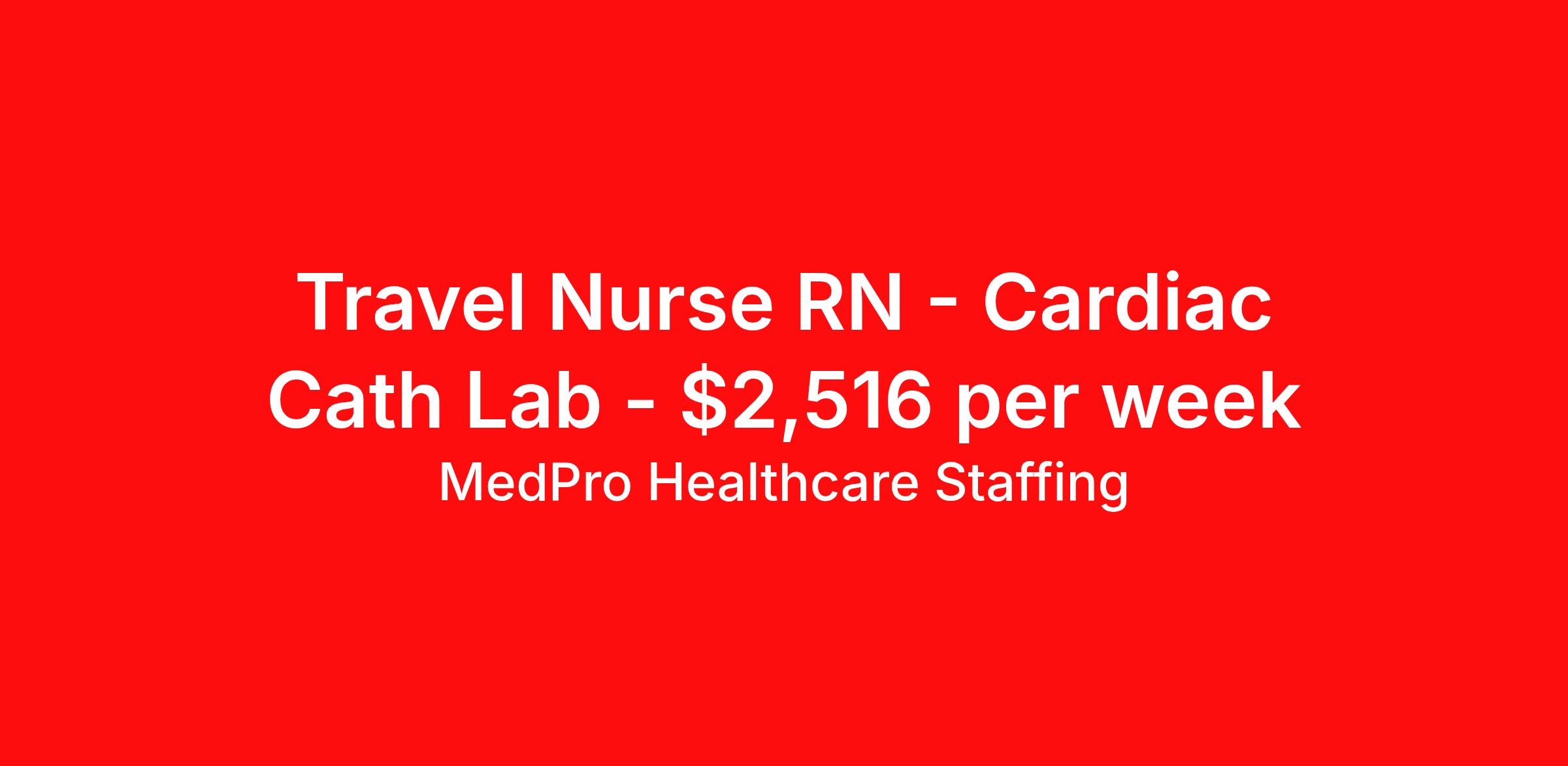 MedPro Healthcare Staffing is seeking a travel nurse RN Cardiac Cath Lab for a travel nursing job in Snellville, Georgia. Job Description & Requirements Specialty: Cardiac Cath Lab Discipline: RN Start Date: 04/06/2026 Duration: 13 weeks 40 hours per week Shift: 10 hours, days Employment Type: Travel MedPro Healthcare Staffing , a Joint Commission-certified staffing agency, is seeking a quality Cath Lab Registered Nurse (RN) for a travel assignment with one of our top healthcare clients. Requirements Active RN License Degree from accredited nursing program BLS & ACLS Certifications Eighteen months of recent experience in an Acute Care Cath Lab setting Benefits Weekly pay and direct deposit Full coverage of all credentialing fees Private housing or housing allowance Group Health insurance for you and your family Company-paid life and disability insurance Travel reimbursement 401(k) matching Unlimited Referral Bonuses up to $1,000 Duties Responsibilities The Cardiac Cath Lab RN performs angioplasties, implants pacemakers and diagnoses cardiac conditions with an invasive catheterization procedure. Administer care for heart disease and heart attack patients by obtaining visual diagnostics of the arteries of the heart. Identify blockages, assisting the physician during procedures, and monitoring the patient’s status at other times. Administer interventional procedures like cardiac catheterizations, angioplasties, pacemaker and/or defibrillator implantation, and related interventional or diagnostic procedures. About Agency MedPro Healthcare Staffing is a Joint Commission certified provider of contract staffing services. Since 1983, we have placed nursing and allied travelers in top healthcare facilities nationwide. Join us today for your very own MedPro Experience®. If qualified and interested, please call for immediate consideration. MedPro Staffing is an Equal Opportunity Employer. All applicants will be considered for employment without attention to race, color, religion, national origin, age, sex, disability, marital status or veteran status. Key Words: Registered Nurse, RN, Cath Lab, Contract Nurse, Travel Nurse, Agency RN, Travel RN, Nursing, Contract, Travel, Cardiac Cath Lab *Weekly payment estimates are intended for informational purposes only and include a gross estimate of hourly wages and reimbursements for meal, incidental, and housing expenses. Your recruiter will confirm your eligibility and provide additional details. MedPro Job ID a0Fcx00000HtfyQEAR. Pay package is based on 10 hour shifts and 40 hours per week (subject to confirmation) with tax-free stipend amount to be determined. Posted job title: Cath Lab Registered Nurse Nursing: Cath Lab Nurse (Diagnostic). About MedPro Healthcare Staffing At MedPro Healthcare Staffing , we believe no one cares more for caregivers than we do. Our mission is simple: you focus on your patients, and we’ll take care of the rest. As a Joint Commission-certified leader in temporary and contract healthcare staffing since 1983, MedPro has proudly connected nursing and allied travelers with top healthcare facilities across the nation. With thousands of job opportunities available nationwide, we make it easy to find assignments that align with your goals and lifestyle. Our on-staff clinical support team—alongside a compassionate group of experienced recruiters—provides hands-on guidance every step of the way. From Day 1 medical benefits and a 401(k) plan to personalized career support, we’re committed to ensuring every professional we serve feels valued, cared for, and empowered to succeed. Guided by a CEO who is a Registered Nurse, MedPro is built on a foundation of clinical insight and genuine compassion for the caregiving community. Through The MedPro Experience® , we deliver travel assignments that are rewarding, memorable, and designed to help you DREAM big, EXPLORE often, and ACHIEVE greatness. Benefits Day 1 medical, dental, and vision benefits for you and your family Weekly pay and direct deposit Unlimited Referral Bonuses starting at $500 On Staff Clinical Support Team Access to nationwide travel assignments MPX Mobile app -24/7 real-time access to jobs, credentials, assignment details, and more Full coverage of all credentialing fees Private housing or housing allowance Tax Free Per Diems, Housing Stipends and Travel Reimbursements Company-paid life and disability insurance Travel reimbursement 401(k) matching Benefits Weekly pay Referral bonus Employee assistance programs