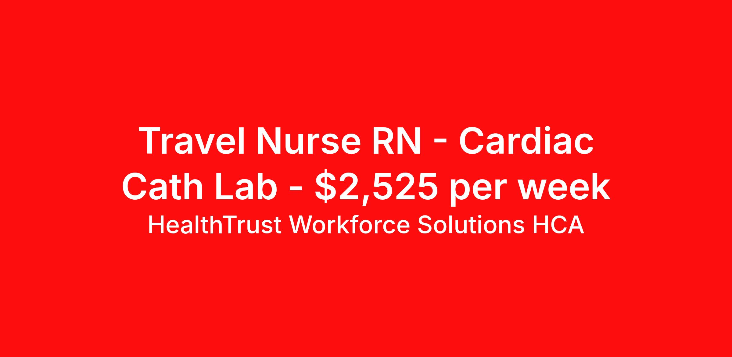 HealthTrust Workforce Solutions HCA is seeking a travel nurse RN Cardiac Cath Lab for a travel nursing job in El Paso, Texas. Job Description & Requirements Specialty: Cardiac Cath Lab Discipline: RN Duration: 13 weeks 40 hours per week Shift: 8 hours, days Employment Type: Travel 982148 Maria Karen Lopez Torres | HealthTrust/ HCA Recruiter | | P: E: | About HealthTrust Workforce Solutions HCA At HealthTrust Workforce Solutions, healthcare is not just about the four walls of a facility but about the people who provide and receive care. Our focus is on empowering healthcare professionals to deliver exceptional patient experiences by providing them with the necessary skills, tools, and support. We partner with healthcare facilities nationwide to ensure that the right professionals are in the right roles. We prioritize our clinicians by giving them a voice and access to opportunities to fulfill their mission of improving lives by providing quality patient care. We are committed to our core values of Trust, Innovation, Adaptability, Courage, and Accountability. We are dedicated to positively impacting the healthcare industry by providing first-priority access to more than 200,000 jobs nationwide to our healthcare professionals. Join us and be part of the HealthTrust family, where you can make a difference every day. We embrace our changing environment, and we maintain a culture that has a rich tradition of transforming itself to meet the challenges of the future. MISSION STATEMENT While putting great people in the right roles is essential, our mission is far greater. We want our clinicians to be part of the HealthTrust family, where healthcare professionals have a voice and are empowered with the right tools and opportunities to fulfill their personal mission of improving lives. Plus, as a preferred partner to thousands of top-performing hospitals, we provide our healthcare professionals with first-priority access to more than 200,000 jobs nationwide. Benefits Dental benefits Vision benefits Referral bonus Continuing Education Life insurance