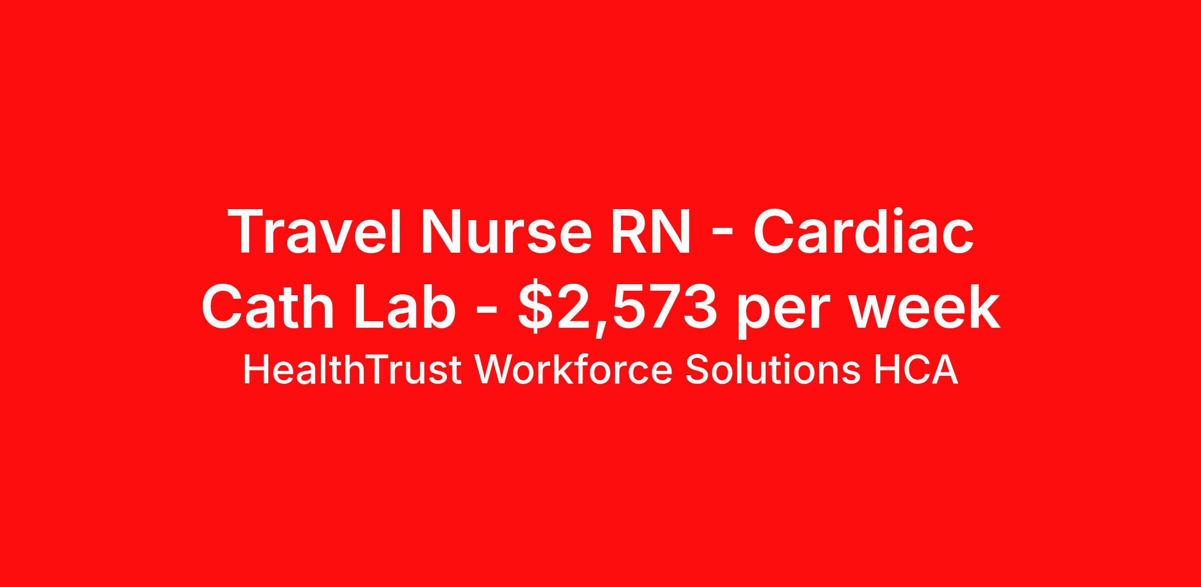 HealthTrust Workforce Solutions HCA is seeking a travel nurse RN Cardiac Cath Lab for a travel nursing job in El Paso, Texas. Job Description & Requirements Specialty: Cardiac Cath Lab Discipline: RN Duration: 13 weeks 40 hours per week Shift: 8 hours, days Employment Type: Travel Number of Beds – 3 Cardiac Cath Labs 1 EP Lab 1 Hybrid Lab Number of Staff – 1 Charge RN, 3 CL RN’s 3 CVT’s Type of staff: Day Shift ) Night Shift - Patient Ratios – 1:1 Type of equipment - EMR – Meditech About HealthTrust Workforce Solutions HCA At HealthTrust Workforce Solutions, healthcare is not just about the four walls of a facility but about the people who provide and receive care. Our focus is on empowering healthcare professionals to deliver exceptional patient experiences by providing them with the necessary skills, tools, and support. We partner with healthcare facilities nationwide to ensure that the right professionals are in the right roles. We prioritize our clinicians by giving them a voice and access to opportunities to fulfill their mission of improving lives by providing quality patient care. We are committed to our core values of Trust, Innovation, Adaptability, Courage, and Accountability. We are dedicated to positively impacting the healthcare industry by providing first-priority access to more than 200,000 jobs nationwide to our healthcare professionals. Join us and be part of the HealthTrust family, where you can make a difference every day. We embrace our changing environment, and we maintain a culture that has a rich tradition of transforming itself to meet the challenges of the future. MISSION STATEMENT While putting great people in the right roles is essential, our mission is far greater. We want our clinicians to be part of the HealthTrust family, where healthcare professionals have a voice and are empowered with the right tools and opportunities to fulfill their personal mission of improving lives. Plus, as a preferred partner to thousands of top-performing hospitals, we provide our healthcare professionals with first-priority access to more than 200,000 jobs nationwide. Benefits Dental benefits Vision benefits Referral bonus Continuing Education Life insurance