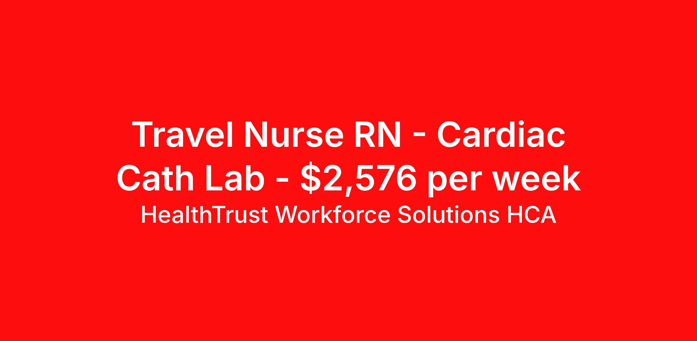 HealthTrust Workforce Solutions HCA is seeking a travel nurse RN Cardiac Cath Lab for a travel nursing job in Houston, Texas. Job Description & Requirements Specialty: Cardiac Cath Lab Discipline: RN Start Date: 04/13/2026 Duration: 13 weeks 40 hours per week Shift: 10 hours, days Employment Type: Travel Not the right fit? No worries – I’ve got jobs all over. Text or call me, Kalee, at and let’s find somewhere that works for you. About HealthTrust Workforce Solutions HCA At HealthTrust Workforce Solutions, healthcare is not just about the four walls of a facility but about the people who provide and receive care. Our focus is on empowering healthcare professionals to deliver exceptional patient experiences by providing them with the necessary skills, tools, and support. We partner with healthcare facilities nationwide to ensure that the right professionals are in the right roles. We prioritize our clinicians by giving them a voice and access to opportunities to fulfill their mission of improving lives by providing quality patient care. We are committed to our core values of Trust, Innovation, Adaptability, Courage, and Accountability. We are dedicated to positively impacting the healthcare industry by providing first-priority access to more than 200,000 jobs nationwide to our healthcare professionals. Join us and be part of the HealthTrust family, where you can make a difference every day. We embrace our changing environment, and we maintain a culture that has a rich tradition of transforming itself to meet the challenges of the future. MISSION STATEMENT While putting great people in the right roles is essential, our mission is far greater. We want our clinicians to be part of the HealthTrust family, where healthcare professionals have a voice and are empowered with the right tools and opportunities to fulfill their personal mission of improving lives. Plus, as a preferred partner to thousands of top-performing hospitals, we provide our healthcare professionals with first-priority access to more than 200,000 jobs nationwide. Benefits Dental benefits Vision benefits Referral bonus Continuing Education Life insurance
