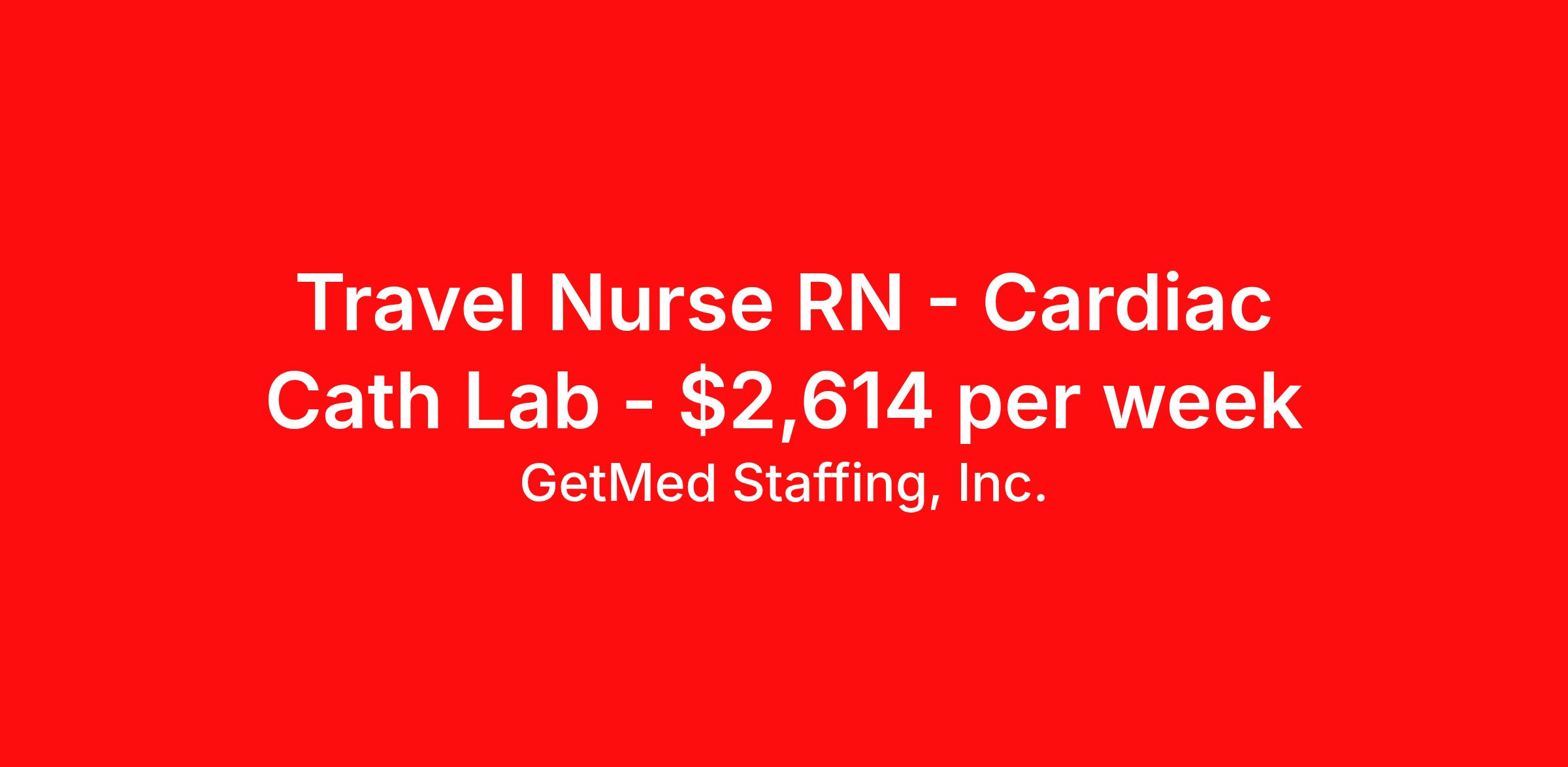 GetMed Staffing, Inc. is seeking a travel nurse RN Cardiac Cath Lab for a travel nursing job in Danbury, Connecticut. Job Description & Requirements Specialty: Cardiac Cath Lab Discipline: RN Start Date: 04/13/2026 Duration: 13 weeks 36 hours per week Shift: 12 hours, days Employment Type: Travel GetMed Staffing is searching for a strong Cath Lab RN to assist our traveler-friendly client. A minimum of 1-2 years of experience is required. Traveling with GetMed Staffing offers the unique opportunity to gain diverse experiences, both personally and professionally. Gain experience that matters. GetMed Staffing, Inc. Job ID 36036766. Pay package is based on 12 hour shifts and 36.0 hours per week (subject to confirmation) with tax-free stipend amount to be determined. Posted job title: Cath Lab:Cath Lab RN,07:00:00-19:00:00 About GetMed Staffing, Inc. We are a diversity owned company, specializing in healthcare recruiting services. We truly understand how important a healthcare travelers' relationship is with their recruiter, as well as our relationship is with our healthcare facilities. We recognize that the needs of our healthcare travelers can vary, and therefore we provide the personalized touch necessary to ensure a successful travel assignment each and every time. Our healthcare facilities and clients benefit from us putting our healthcare travelers first. GetMed Staffing is excited to be a leader within the industry by focusing on providing healthcare travelers with more choices and possibilities as they plan for their next healthcare travel assignment. Benefits Life insurance Medical benefits Dental benefits Vision benefits 401k retirement plan