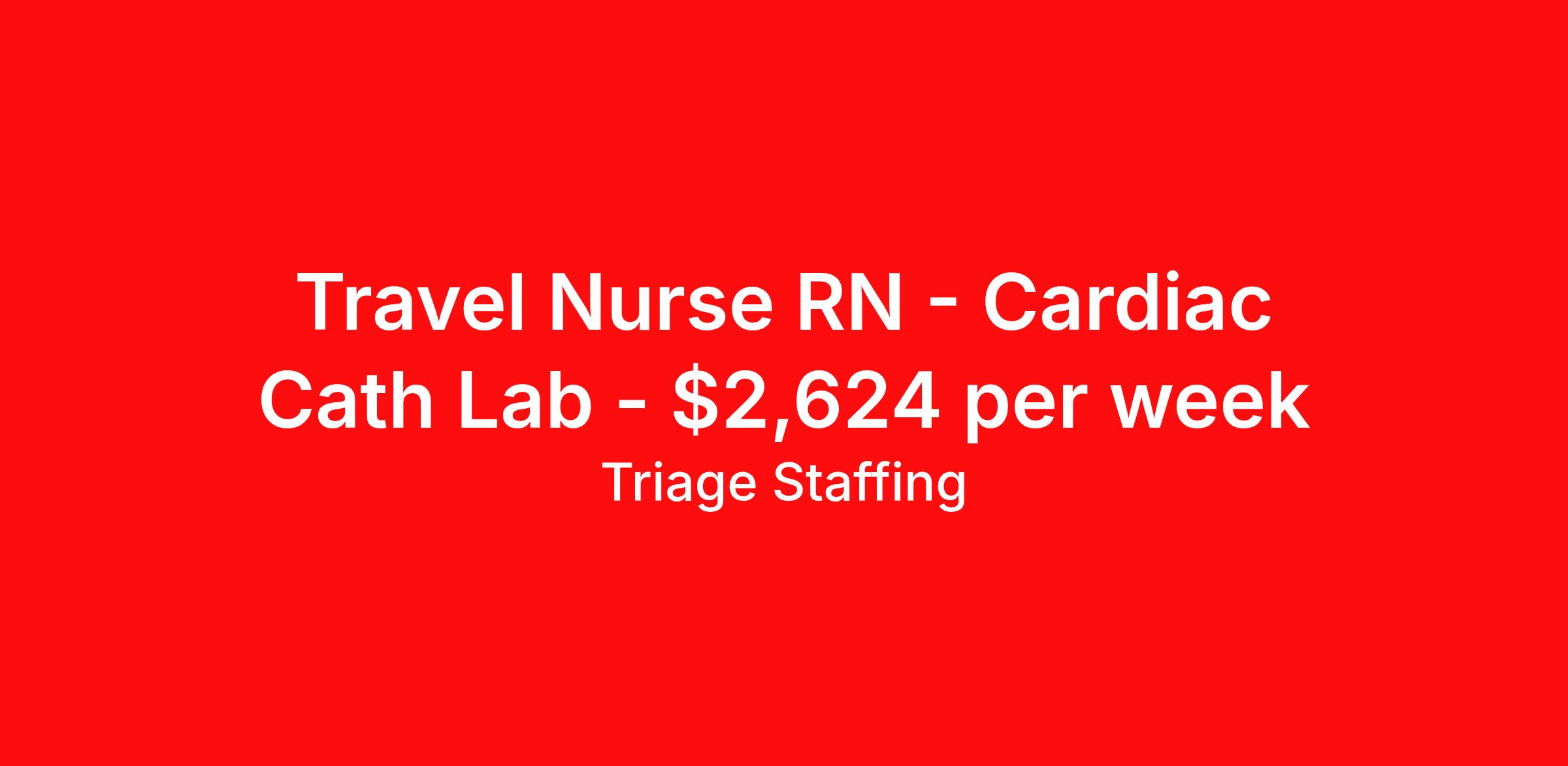 Triage Staffing is seeking a travel nurse RN Cardiac Cath Lab for a travel nursing job in Wellington, Florida. Job Description & Requirements Specialty: Cardiac Cath Lab Discipline: RN Start Date: ASAP Duration: 13 weeks 40 hours per week Shift: 8 hours, days Employment Type: Travel Travel Nursing: Cath Lab Wellington Location: Wellington Start Date: 3/9/2026 Shift Details: 8H Days 40 hours per week Length: 13 WEEKS Apply for specific facility details.Cath Lab RN Triage Staffing Job ID KRUGPANT. Posted job title: Nursing: Cath Lab About Triage Staffing At Triage, we prefer to be real . Real about expectations—both ours and yours. Real about how a decision you make today could affect your tomorrows. Real about how compensation actually works. Real about how great—or grating—your next supervisor may be. Being real allows everyone at Triage to be ready . Ready to serve you with real honesty. So if that gig near the ocean is really no day at the beach, or that third shift comes with a second-class rate, we tell you. So you can be ready, too. We staff all five major divisions of acute care—nursing, lab, radiology, cardiopulmonary and rehab therapy, offering: - Competitive, custom pay packages - One point of contact for both travelers and facilities (per division) - A reliable recruiter who's got your back throughout your entire assignment - In-house compliance and accounting specialists - A clinical liaison team available 24/7 to offer medical and professional support and career development - A mentoring program that is run and managed by actual clinicians—yeah, you read that right - And more (because of course there’s more) Are we the biggest? No. Are we the best? That’s rather subjective, but we’re trying to be. Will we work like hell to get you as close to your idea of heaven as possible? Yes. Yes, we will. Benefits: Day One comprehensive, nationwide insurance plans for health, vision and dental and life—including a HSA option Day One 401(k) program with employer-matching contributions once eligible Facility cancelling protection—your time is money on and off-the-clock Guaranteed hours Weekly paychecks via direct deposit Earned vacation bonuses for time worked Paid holidays Employee assistance program (EAP)—your mental health is important, too Continuing education, certification and licensing reimbursement Workers comp—because accidents happen Top-rated professional liability insurance Company provided housing options Referral bonus—$750 in your pocket after they’ve completed a 13-week assignment
