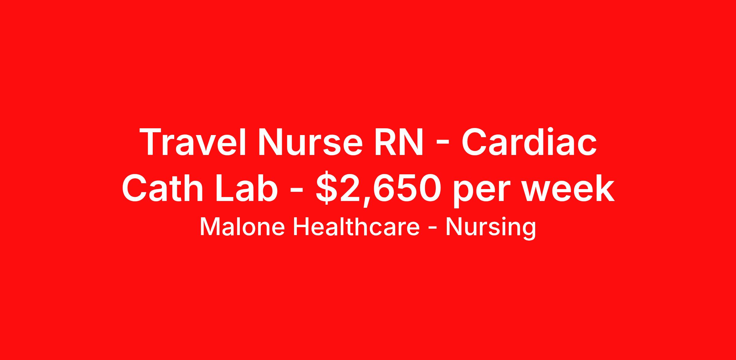 Malone Healthcare - Nursing is seeking a travel nurse RN Cardiac Cath Lab for a travel nursing job in South Charleston, West Virginia. Job Description & Requirements Specialty: Cardiac Cath Lab Discipline: RN Start Date: 04/15/2026 Duration: 13 weeks 36 hours per week Shift: 12 hours, days, nights Employment Type: Travel Cath Lab RN Unit: Cath Lab of Suites/Labs: 2 Average Cases/Day: 10–15 Certifications & Experience RN: BLS, ACLS Rad Tech: ARRT Experience: Minimum 1 year Cath Lab or Rad Tech experience Preferred: EKOS experience (training available) Patient Population / Procedures Diagnostic left/right heart caths, PCI, IABP, Impella, temporary pacemaker, TCAR, EVAR, EKOS, AIF, IVC filters, Infusaports, Permacaths Vascular surgeon procedures: filters, venograms Job Duties Rad Techs: Scrub and assist physician, sterile technique RNs: Circulate, sedate, and complete documentation Equipment & EMR Siemens software and equipment Scheduling & Call Shift: 5 days/week, times vary with case schedule On Call: RN & Rad Techs, rotational, 30-min response time Weeknight/Weekend: One week on call per 4-week schedule; breaks allowed Holiday: Rotational Floating: None (optional based on experience for extra hours) Staffing & Orientation Manager/Charge: Director, Coordinator, Charge Nurse Techs: Yes, Rad Techs Orientation: Hospital Nursing orientation, department computer training, ~36 hours Dress Code Surgical attire provided (lead not provided) About Malone Healthcare - Nursing With a commitment to providing a higher standard of service and experience in patient care, Malone Healthcare places expert nurses and allied health professionals in rewarding careers throughout the United States. As a leading healthcare staffing agency, Malone’s focus on compliance and integrity translates to a seamless experience for our team members and partner facilities. When you work with Malone Healthcare, you can rely on over 50 years of proven experience placing exceptional professionals in quality healthcare settings. Benefits Weekly pay Holiday Pay Guaranteed Hours Continuing Education 401k retirement plan Pet insurance Referral bonus Medical benefits Dental benefits Vision benefits License and certification reimbursement Life insurance