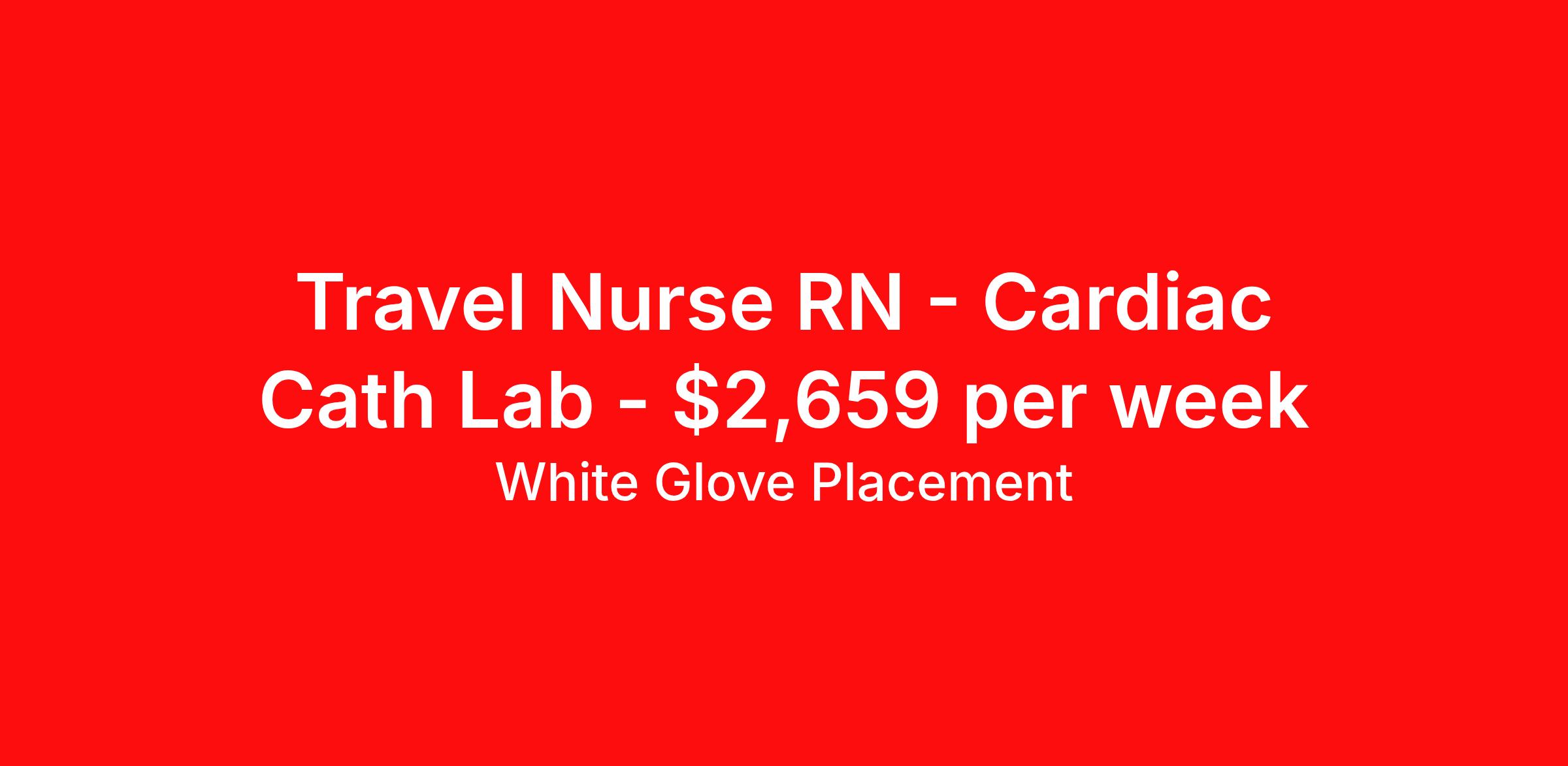 White Glove Placement is seeking a travel nurse RN Cardiac Cath Lab for a travel nursing job in Passaic, New Jersey. Job Description & Requirements Specialty: Cardiac Cath Lab Discipline: RN Start Date: 03/23/2026 Duration: 8 weeks 40 hours per week Shift: 8 hours, days Employment Type: Travel White Glove Placement Job ID 348077. Pay package is based on 8 hour shifts and 40 hours per week (subject to confirmation) with tax-free stipend amount to be determined. About White Glove Placement White Glove Placement, Inc., recruits nurses for some of the most sought-after travel nursing jobs at hospitals, nursing homes, schools, clinics, correctional facilities, group homes, homecare and more. If you enjoy traveling and new experiences, you will have the opportunity to expand your horizons as a White Glove travel nurse for one of the best travel nursing companies. Your cultural repertoire will be enhanced by the nuances and diversity of New York and the Northeast. In addition, you will have access to an array of recreational activities that may include visiting historic landmarks, majestic skyscrapers, Broadway plays, exotic cuisines and multiple entertainment venues. Trust the best travel nursing agency to find the perfect position for you. Live your best professional life with the best travel nursing jobs, with the best salary, in exciting and exotic places. Benefits Weekly pay Company provided housing options Sick pay Wellness and fitness programs Referral bonus Medical benefits Dental benefits