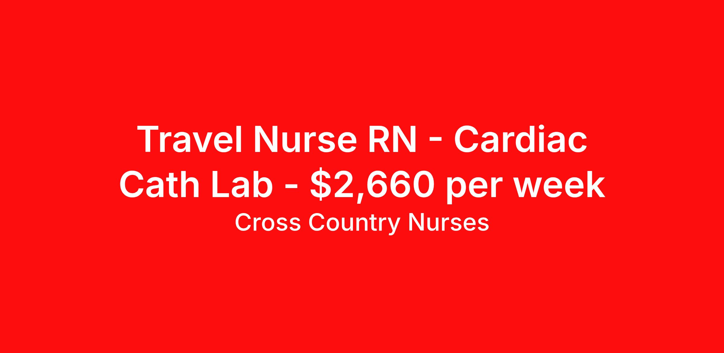 Cross Country Nurses is seeking a travel nurse RN Cardiac Cath Lab for a travel nursing job in Modesto, California. Job Description & Requirements Specialty: Cardiac Cath Lab Discipline: RN Start Date: 04/06/2026 Duration: 13 weeks 40 hours per week Shift: 8 hours, days Employment Type: Travel Job Description As a cardiac catheterization lab nurse (RN CCL), you will assist physicians in performing a variety of diagnostic and interventional procedures, such as cardiac catheterizations, valvuloplasties, and angioplasties. Your duties will range from prepping patients for their procedure and ensuring informed consent to monitoring vital signs and administering IVs. During the procedure, you will assist the physician, monitor and assess the patient and administer medications as needed. Afterwards, you will stay with the patients until they are stabilized to be transferred or discharged. Minimum Requirements At least 1 year of recent acute care experience in specialty Active RN license Benefits The benefits of taking a travel nursing job with Cross Country include: Private housing or generous housing allowance Comprehensive health insurance with prescription coverage Dependent health insurance with prescription coverage Competitive salaries Referral bonuses Travel reimbursement 401(k) retirement plan Direct deposit/free checking Unlimited free CE credits Cross Country Job ID 1235837. Pay package is based on 8 hour shifts and 40 hours per week (subject to confirmation) with tax-free stipend amount to be determined. Posted job title: Registered Nurse / Cardiac Cath Lab About Cross Country Nurses You care for others — we’re here to care for you. At Cross Country, we know travel nursing is about more than just the job. It’s about building a career that supports your lifestyle, your values, and your impact. We offer competitive pay, full benefits, and 24/7 support from a team that truly understands what it means to be on the front lines. Wherever your journey takes you, we’re with you every step of the way. Let’s build your best life — one assignment at a time. Benefits 401k retirement plan Referral bonus