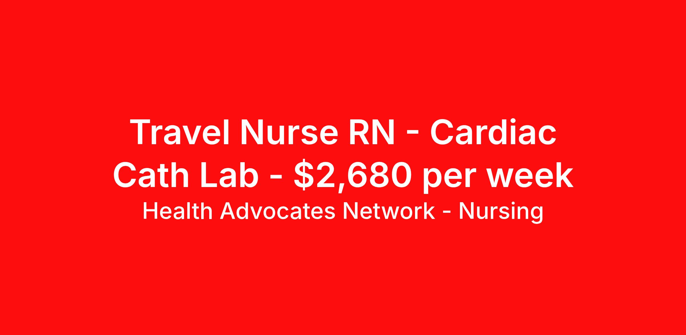 Health Advocates Network - Nursing is seeking a travel nurse RN Cardiac Cath Lab for a travel nursing job in Cleveland, Ohio. Job Description & Requirements Specialty: Cardiac Cath Lab Discipline: RN Start Date: 04/26/2026 Duration: 12 weeks 40 hours per week Shift: 10 hours, days Employment Type: Travel HANStaff Job ID 469984. Pay package is based on 10 hour shifts and 40 hours per week (subject to confirmation) with tax-free stipend amount to be determined. Posted job title: RN - Cath Lab About Health Advocates Network - Nursing Health Advocates Network was founded on the basis of a shared aspiration, to improve the way healthcare staffing is done. We are a company established and led by nurses. Our flexible approach enables us to develop solutions customized to your specific needs. From short- and long-term travel contracts to local and per diem assignments and more, we are here to get you to your next adventure! By solving challenges, providing the best placements, and advocating for you, we stand to help you thrive and pave the path forward in your career. Click on the videos below to learn more about our values!