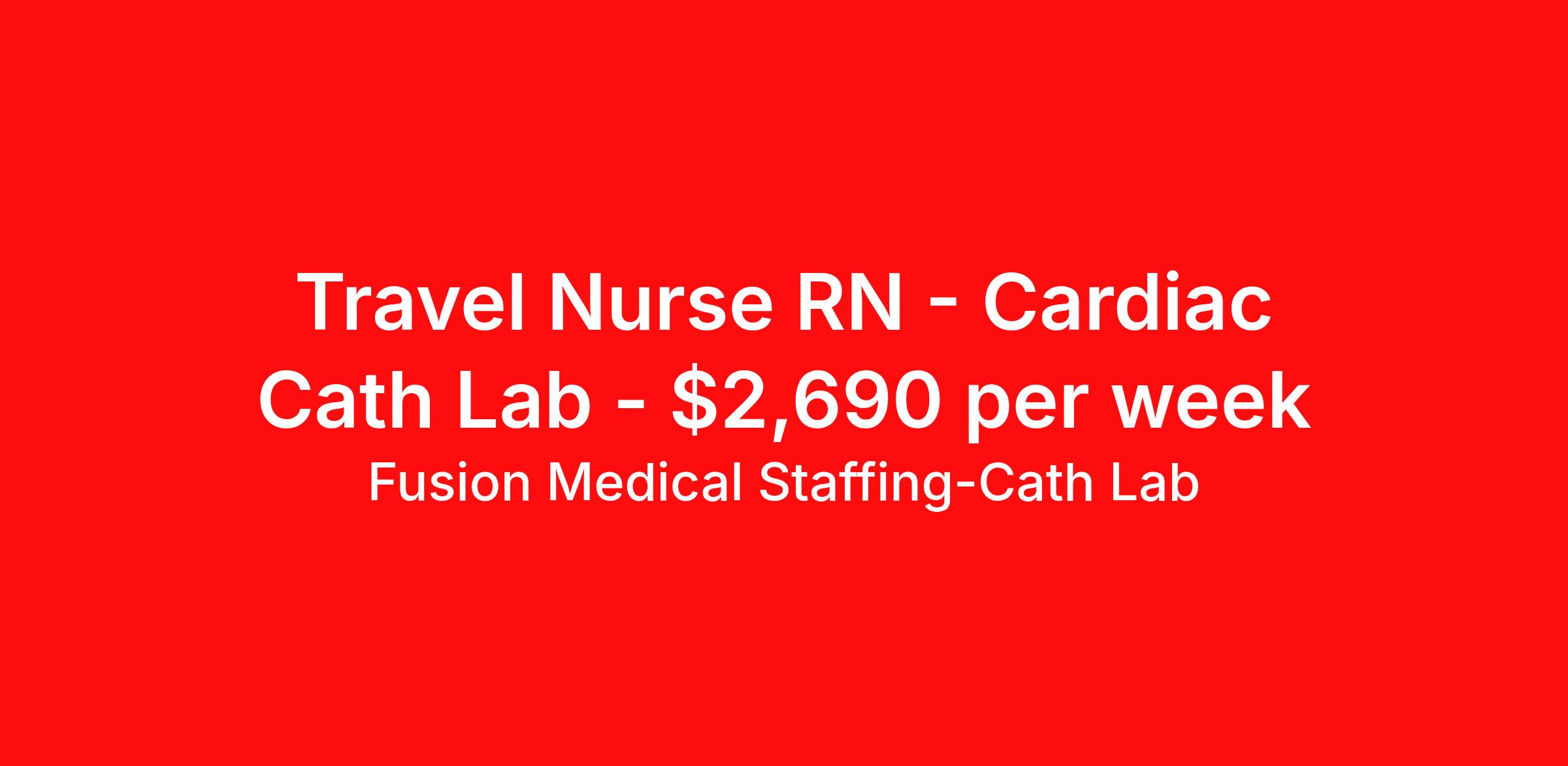Fusion Medical Staffing-Cath Lab is seeking a travel nurse RN Cardiac Cath Lab for a travel nursing job in Glenwood Springs, Colorado. Job Description & Requirements Specialty: Cardiac Cath Lab Discipline: RN Start Date: ASAP Duration: 13 weeks 40 hours per week Shift: 8 hours Employment Type: Travel Travel Cath Lab RN Company: Fusion Medical Staffing Location: Facility in Glenwood Springs, Colorado Job Details Fusion Medical Staffing is seeking a skilled Cardiac Cath Lab RN for a 13-week travel assignment in Glenwood Springs, Colorado. As a member of our team, you'll have the opportunity to make a positive impact on the lives of patients while enjoying competitive pay, comprehensive benefits, and the support of a dedicated clinical team. Required Qualifications: One year’s recent experience as a Cath Lab RN Valid RN license in compliance with state regulations Current BLS (AHA/ ARC) Certification Current ACLS Certification Preferred Qualifications: PALS or ENPC Certifications RCIS certification Other certifications and licenses may be required for this position Summary: The Travel Cath Lab RN provides specialized care for patients undergoing cardiac catheterization and interventional treatments. The RN prepares patients for procedures, assists during interventions, and monitors immediate post-procedure recovery. Working closely with cardiologists and cath lab teams, this role requires advanced cardiac care skills, cardiac catheterization skills, strong communication, and the ability to adapt quickly while maintaining strict safety and regulatory standards. Essential Work Functions: Conduct assessment of patients prior to procedures, including reviewing medical history and performing physical exams Assist in positioning patients correctly for the procedure and ensure EKG electrodes and cardiac leads are properly placed Assist physicians during procedures, including the placement of catheters, wires, balloons, stents, structural heart devices, and other cardiac interventions Operate and monitor hemodynamic equipment, recognizing and responding to changes in cardiac rhythms and hemodynamic waveforms Assist in arterial and/or venous sheath removal using closure devices, manual pressure, or mechanical compression, and transport patients to the appropriate recovery area Monitor vital signs, ECG, and hemodynamic parameters during cardiac catheterization and interventional procedure Support post-procedure care, including monitoring patient recovery and ensuring a smooth transition to the next phase of care Maintain and troubleshoot cath lab equipment, ensuring everything is functioning properly and fully stocked for procedures Communicate effectively with team members, patients, families, and physicians to provide seamless care Adhere to hospital safety protocols, infection control guidelines, and regulatory standards Perform other duties as assigned within the scope of practice Required Essential Skills: Critical thinking, service excellence, and good interpersonal communication skills The ability to read, write, and communicate in the English language Ability to read/comprehend written instructions, follow verbal instructions, and proficiency in PC skills Physical Abilities - Must be able to remain in a stationary position, move about, move equipment (50-100lbs), push, pull, and bend Interpersonal Skills - Must be able to work effectively with a variety of personnel (professional and ancillary) to present a positive attitude and professionalism Technical/Motor Skills - Must have the ability to grasp, perform fine manipulation, push/pull, and move about when assisting with procedures and/or using department equipment Mental Requirements - Must be able to cope with frequent contact with the general public and customers while meeting deadlines under pressure. Must be able to work under close supervision occasionally, as well as working without assistance from other personnel. Must be able to contend with irregular activity schedules occasionally and continuous concentration to detail Sensory - Must possess visual acuity and ability to effectively communicate Benefits Include: Highly competitive pay for travel professionals Comprehensive medical, dental, and vision insurance with first day coverage Paid Time Off (PTO) after 1560 hours Life and Short-term disability offered 401(k) matching Aggressive Refer-a-friend Bonus Program 24/7 recruiter support Reimbursement for licensure and CEUs Why Choose Fusion? At Fusion Medical Staffing, our goal is to improve the lives of everyone we touch, and we're always looking for people like you to join our mission. Your passion for helping others deserves a partner just as committed to supporting you — that’s why we offer day one insurance, $0 copay for mental health services, scholarships and awards, exclusive discounts, and more. From your personal recruiter to our clinical and traveler experience teams, we’re here to guide and celebrate you along your journey. You take care of others; we take care of you. Other Duties Disclaimer: To perform this job successfully, an individual must be able to perform each essential duty satisfactorily. The requirements listed are representative of the knowledge, skill, and/or ability required. Reasonable accommodations may be made to enable individuals with disabilities to perform the essential functions. Other duties may be assigned. This job description is not a comprehensive list of all activities, duties, or responsibilities that are required of the employee for this job and is subject to change at any time with or without notice. Start your rewarding career as a Travel Cath Lab RN with Fusion Medical Staffing and join our mission to improve lives. Apply now! *Fusion is an EOE/E-Verify Employer Fusion Medical Staffing - Cath Lab Job ID 1875421. Pay package is based on 8 hour shifts and 40 hours per week (subject to confirmation) with tax-free stipend amount to be determined. About Fusion Medical Staffing-Cath La