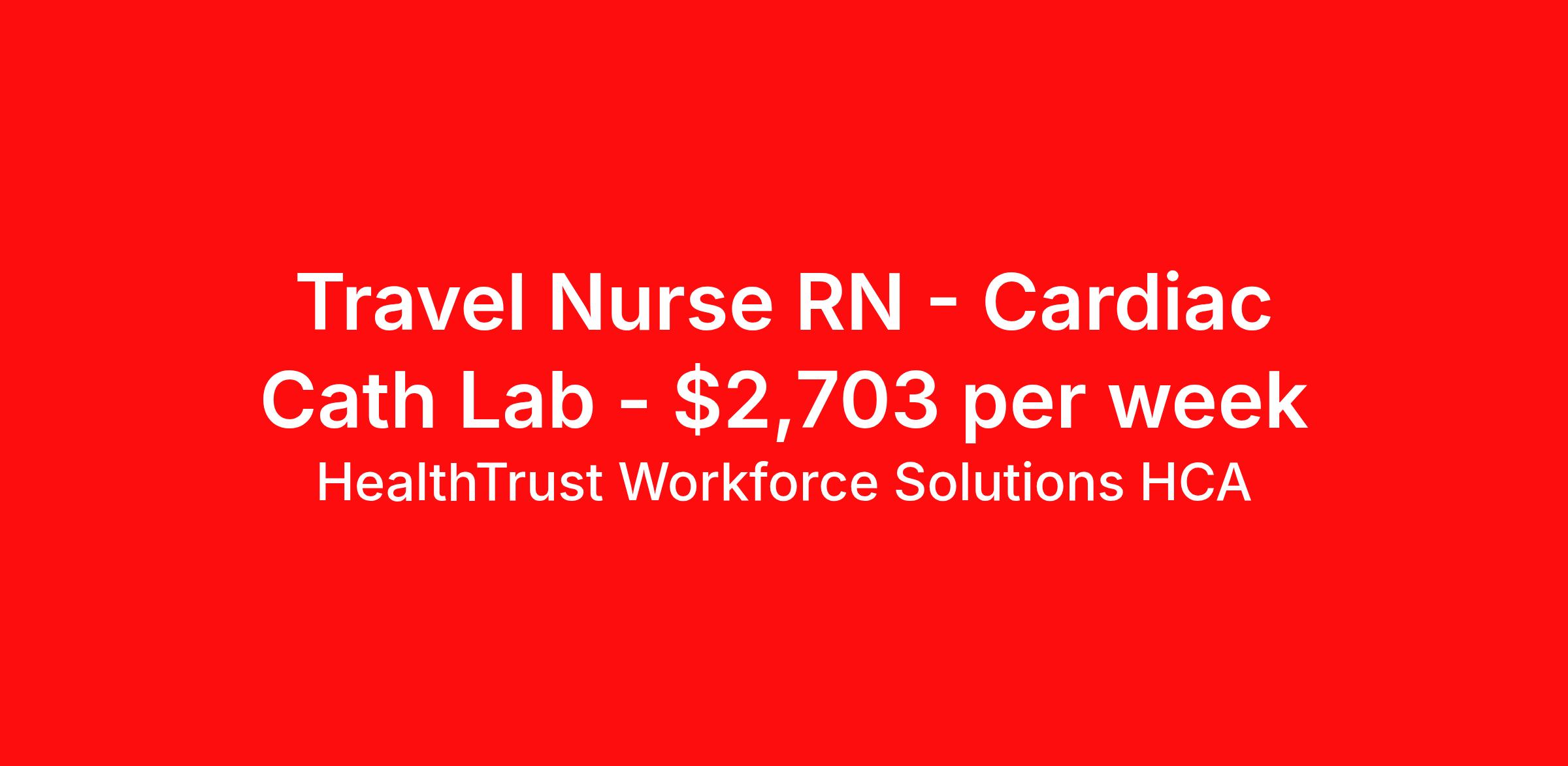 HealthTrust Workforce Solutions HCA is seeking a travel nurse RN Cardiac Cath Lab for a travel nursing job in Richmond, Virginia. Job Description & Requirements Specialty: Cardiac Cath Lab Discipline: RN Start Date: 04/06/2026 Duration: 13 weeks 36 hours per week Shift: 12 hours, days Employment Type: Travel Unit Information: Cath Lab` Location: Chippenham Hospital Address: 7101 Jahnke Rd, Richmond, VA 23225 Floor: 3rd Building: Levinson General Information Tell us about the unit(s): · Number of Beds – 3 cath labs · Number of Staff – 10-11 staff per day in cath lab · Type of staff: o Day Shift – Mix of RNs and cardiovascular technologists o Night Shift – 0 · Patient Ratios – 3 staff per room · Type of equipment – GE X-ray/MacLab · EMR – Meditech Typical hiring profile Skill Set Most recruited for: Must have : candidates without these skills will not be considered for the role. · Experience working in an interventional cardiac cath lab Preferred or nice to have : candidates with these skills will be considered first. · Experience working in a high-volume lab handling complex cases List typical procedures performed on unit(s): · Diagnostic and interventional cardiac catheterizations · Impella, balloon-pump · Peripheral cases · Complex PCIs · Occasional devices Best personality Fit: · Easy-going, kind, friendly · Able to work in a fast-paced, busy lab REQUIRED CERTIFICATIONS: · RN, , RT Floating Area(s): · None Dress Code : · Scrub Color/Attire – Light blue (hospital will provide) Jayden Williamson | Healthcare Recruiter | HealthTrust Workforce Solutions | e: About HealthTrust Workforce Solutions HCA At HealthTrust Workforce Solutions, healthcare is not just about the four walls of a facility but about the people who provide and receive care. Our focus is on empowering healthcare professionals to deliver exceptional patient experiences by providing them with the necessary skills, tools, and support. We partner with healthcare facilities nationwide to ensure that the right professionals are in the right roles. We prioritize our clinicians by giving them a voice and access to opportunities to fulfill their mission of improving lives by providing quality patient care. We are committed to our core values of Trust, Innovation, Adaptability, Courage, and Accountability. We are dedicated to positively impacting the healthcare industry by providing first-priority access to more than 200,000 jobs nationwide to our healthcare professionals. Join us and be part of the HealthTrust family, where you can make a difference every day. We embrace our changing environment, and we maintain a culture that has a rich tradition of transforming itself to meet the challenges of the future. MISSION STATEMENT While putting great people in the right roles is essential, our mission is far greater. We want our clinicians to be part of the HealthTrust family, where healthcare professionals have a voice and are empowered with the right tools and opportunities to fulfill their personal mission of improving lives. Plus, as a preferred partner to thousands of top-performing hospitals, we provide our healthcare professionals with first-priority access to more than 200,000 jobs nationwide. Benefits Dental benefits Vision benefits Referral bonus Continuing Education Life insurance