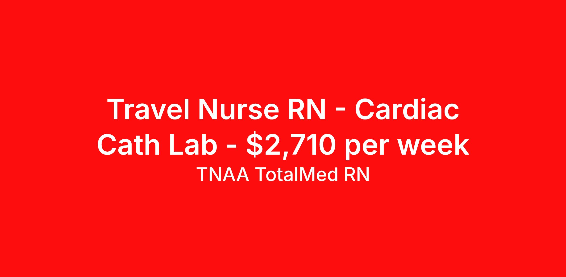 TNAA TotalMed RN is seeking a travel nurse RN Cardiac Cath Lab for a travel nursing job in Boston, Massachusetts. Job Description & Requirements Specialty: Cardiac Cath Lab Discipline: RN Start Date: 03/30/2026 Duration: 13 weeks 36 hours per week Shift: 12 hours, nights Employment Type: Travel About TNAA TotalMed RN TotalMed is a Top Ten, travel nursing and healthcare staffing agency with the mission of igniting purpose in healthcare. The organization staffs nurses, therapists, pharmacists, and other clinicians of all specialties in all 50 states. They offer local and travel jobs and match caregivers with the right organization to assist both facilities and patients. As an organization, they focus on putting highly-skilled staff into facilities to ensure adequate staffing for a better patient experience. TotalMed specializes in recruiting and placing healthcare professionals in travel, PRN, and permanent positions across the country in Nursing and Allied Health. Throughout 2020, the organization filled roles at even the most short-staffed facilities during the most challenging time in healthcare. By matching the right travel healthcare professional with the right organization, TotalMed continues to offer a lifeline to facilities and their patients. Benefits Weekly pay Guaranteed Hours Continuing Education 401k retirement plan Sick pay Wellness and fitness programs Referral bonus Employee assistance programs Medical benefits Dental benefits Vision benefits Benefits start day 1
