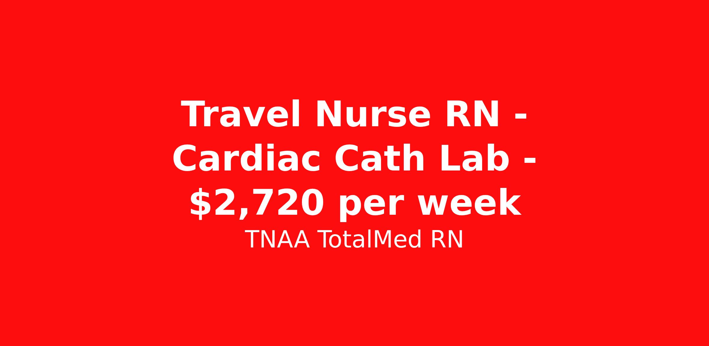 TNAA TotalMed RN is seeking a travel nurse RN Cardiac Cath Lab for a travel nursing job in Oklahoma City, Oklahoma. Job Description & Requirements Specialty: Cardiac Cath Lab Discipline: RN Duration: 13 weeks 40 hours per week Shift: 10 hours, days Employment Type: Travel About TNAA TotalMed RN TotalMed is a Top Ten, travel nursing and healthcare staffing agency with the mission of igniting purpose in healthcare. The organization staffs nurses, therapists, pharmacists, and other clinicians of all specialties in all 50 states. They offer local and travel jobs and match caregivers with the right organization to assist both facilities and patients. As an organization, they focus on putting highly-skilled staff into facilities to ensure adequate staffing for a better patient experience. TotalMed specializes in recruiting and placing healthcare professionals in travel, PRN, and permanent positions across the country in Nursing and Allied Health. Throughout 2020, the organization filled roles at even the most short-staffed facilities during the most challenging time in healthcare. By matching the right travel healthcare professional with the right organization, TotalMed continues to offer a lifeline to facilities and their patients. Benefits Weekly pay Guaranteed Hours Continuing Education 401k retirement plan Sick pay Wellness and fitness programs Referral bonus Employee assistance programs Medical benefits Dental benefits Vision benefits Benefits start day 1