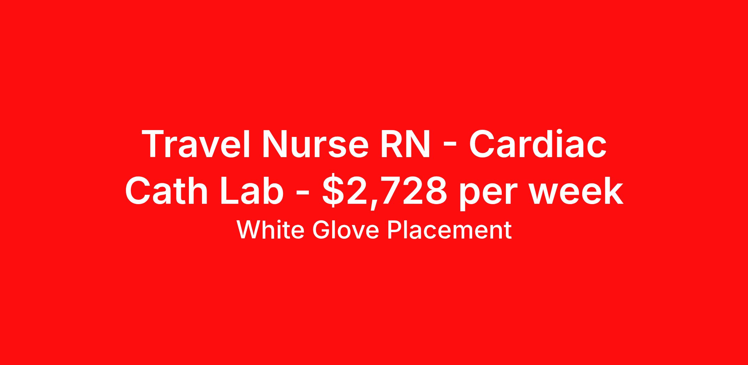 White Glove Placement is seeking a travel nurse RN Cardiac Cath Lab for a travel nursing job in Ithaca, New York. Job Description & Requirements Specialty: Cardiac Cath Lab Discipline: RN Start Date: 04/02/2026 Duration: 13 weeks 40 hours per week Shift: 10 hours, days Employment Type: Travel White Glove Placement Job ID 350504. Pay package is based on 10 hour shifts and 40 hours per week (subject to confirmation) with tax-free stipend amount to be determined. About White Glove Placement White Glove Placement, Inc., recruits nurses for some of the most sought-after travel nursing jobs at hospitals, nursing homes, schools, clinics, correctional facilities, group homes, homecare and more. If you enjoy traveling and new experiences, you will have the opportunity to expand your horizons as a White Glove travel nurse for one of the best travel nursing companies. Your cultural repertoire will be enhanced by the nuances and diversity of New York and the Northeast. In addition, you will have access to an array of recreational activities that may include visiting historic landmarks, majestic skyscrapers, Broadway plays, exotic cuisines and multiple entertainment venues. Trust the best travel nursing agency to find the perfect position for you. Live your best professional life with the best travel nursing jobs, with the best salary, in exciting and exotic places. Benefits Weekly pay Company provided housing options Sick pay Wellness and fitness programs Referral bonus Medical benefits Dental benefits