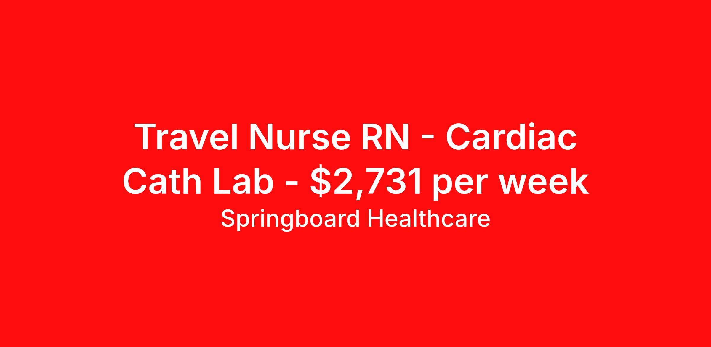 Springboard Healthcare is seeking a travel nurse RN Cardiac Cath Lab for a travel nursing job in Passaic, New Jersey. Job Description & Requirements Specialty: Cardiac Cath Lab Discipline: RN Start Date: 03/23/2026 Duration: 13 weeks 40 hours per week Shift: 8 hours Employment Type: Travel Springboard Healthcare Job ID 826952. Pay package is based on 8 hour shifts and 40 hours per week (subject to confirmation) with tax-free stipend amount to be determined. Posted job title: Cath Lab RN