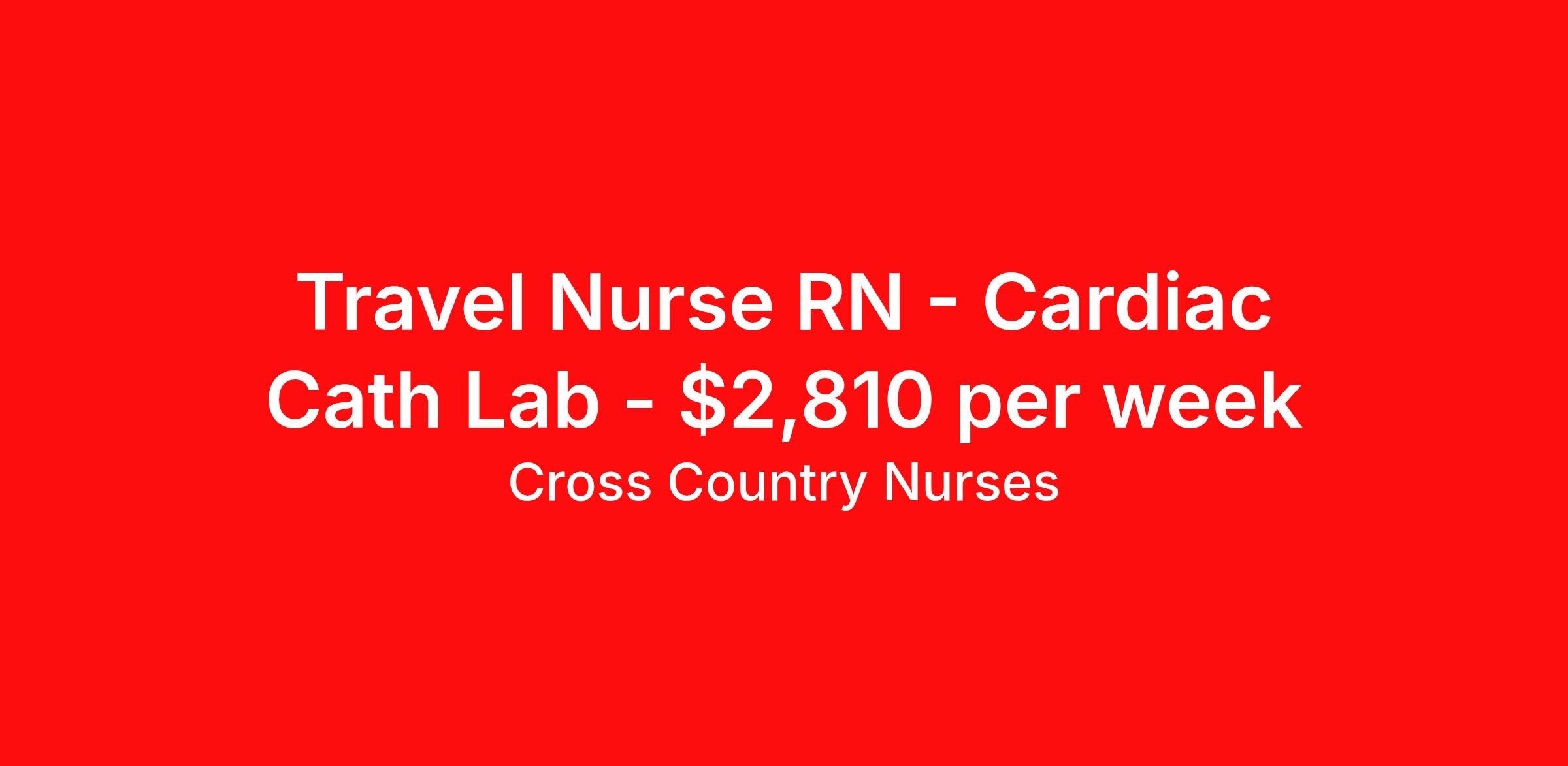 Cross Country Nurses is seeking a travel nurse RN Cardiac Cath Lab for a travel nursing job in Passaic, New Jersey. Job Description & Requirements Specialty: Cardiac Cath Lab Discipline: RN Start Date: 03/23/2026 Duration: 8 weeks 40 hours per week Shift: 8 hours, days Employment Type: Travel Job Description As a cardiac catheterization lab nurse (RN CCL), you will assist physicians in performing a variety of diagnostic and interventional procedures, such as cardiac catheterizations, valvuloplasties, and angioplasties. Your duties will range from prepping patients for their procedure and ensuring informed consent to monitoring vital signs and administering IVs. During the procedure, you will assist the physician, monitor and assess the patient and administer medications as needed. Afterwards, you will stay with the patients until they are stabilized to be transferred or discharged. Minimum Requirements At least 1 year of recent acute care experience in specialty Active RN license Benefits The benefits of taking a travel nursing job with Cross Country include: Private housing or generous housing allowance Comprehensive health insurance with prescription coverage Dependent health insurance with prescription coverage Competitive salaries Referral bonuses Travel reimbursement 401(k) retirement plan Direct deposit/free checking Unlimited free CE credits Posted Date: 2026-03-11 Cross Country Job ID 1222735. Pay package is based on 8 hour shifts and 40 hours per week (subject to confirmation) with tax-free stipend amount to be determined. Posted job title: Registered Nurse / Cardiac Cath Lab About Cross Country Nurses You care for others — we’re here to care for you. At Cross Country, we know travel nursing is about more than just the job. It’s about building a career that supports your lifestyle, your values, and your impact. We offer competitive pay, full benefits, and 24/7 support from a team that truly understands what it means to be on the front lines. Wherever your journey takes you, we’re with you every step of the way. Let’s build your best life — one assignment at a time. Benefits 401k retirement plan Referral bonus