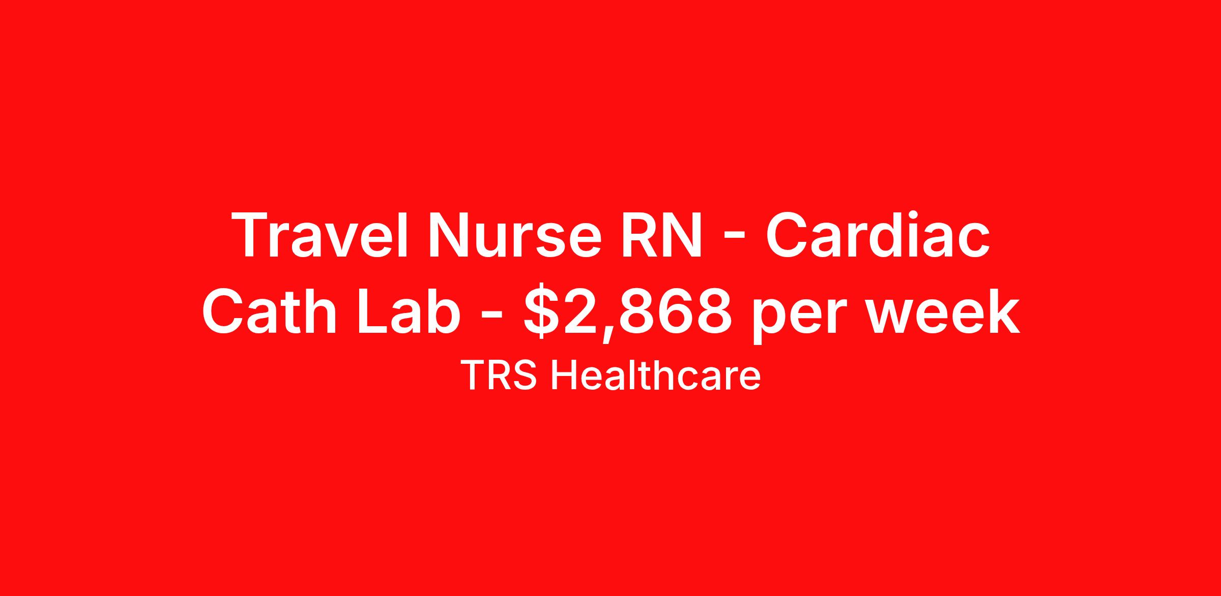 TRS Healthcare is seeking a travel nurse RN Cardiac Cath Lab for a travel nursing job in Appleton, Wisconsin. Job Description & Requirements Specialty: Cardiac Cath Lab Discipline: RN Start Date: 03/30/2026 Duration: 13 weeks 40 hours per week Shift: 8 hours, days Employment Type: Travel TRS Healthcare Job ID 1433069. Pay package is based on 8 hour shifts and 40 hours per week (subject to confirmation) with tax-free stipend amount to be determined. Posted job title: Radiology - Cardiac Cath Lab Registered Nurse About TRS Healthcare TRS Healthcare has been a leader in the healthcare staffing industry for over 25 years, providing exceptional career opportunities for travel nurses and allied health professionals. An RN-founded, woman-owned company, TRS Healthcare has team members in all 50 states. We recruit and support registered nurses, licensed practical nurses, surgical technicians, respiratory therapists, imaging technologists, laboratory specialists, and other experienced nursing and allied healthcare professionals. We staff hundreds of healthcare facilities across the U.S. in urban, rural, and underserved areas, including multi-state hospital systems, critical access hospitals, rural community hospitals, long-term care facilities, trauma centers, standalone clinics, and more. Learn more about TRS Healthcare at trshealthcare.com .