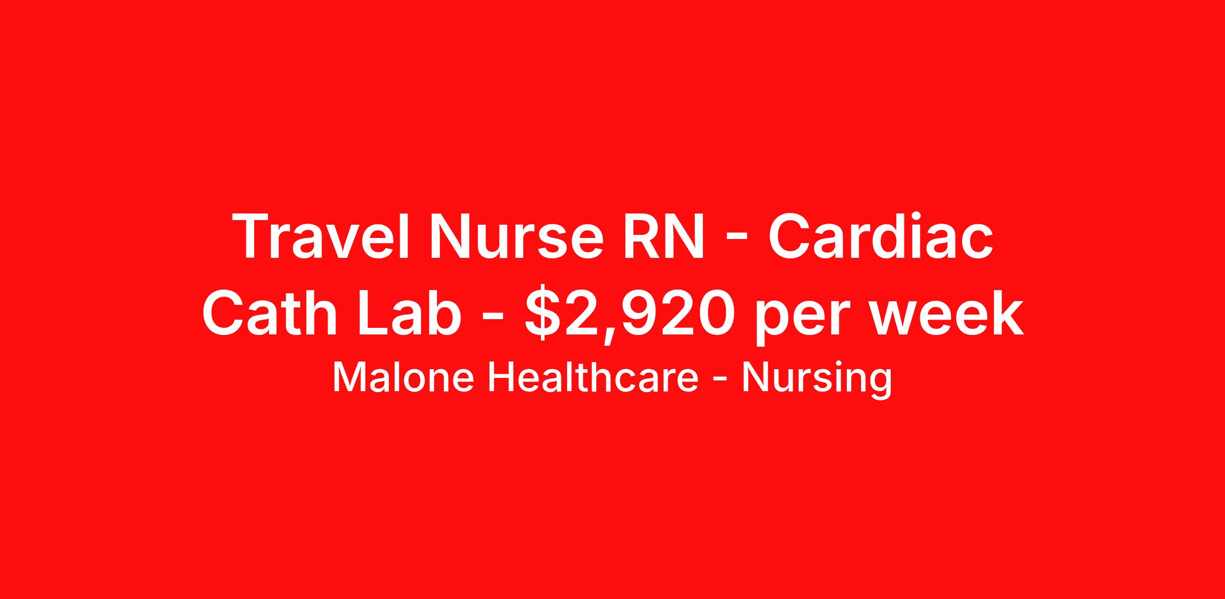 Malone Healthcare - Nursing is seeking a travel nurse RN Cardiac Cath Lab for a travel nursing job in New Lenox, Illinois. Job Description & Requirements Specialty: Cardiac Cath Lab Discipline: RN Start Date: 04/13/2026 Duration: 13 weeks 40 hours per week Shift: 10 hours, days Employment Type: Travel About Malone Healthcare - Nursing With a commitment to providing a higher standard of service and experience in patient care, Malone Healthcare places expert nurses and allied health professionals in rewarding careers throughout the United States. As a leading healthcare staffing agency, Malone’s focus on compliance and integrity translates to a seamless experience for our team members and partner facilities. When you work with Malone Healthcare, you can rely on over 50 years of proven experience placing exceptional professionals in quality healthcare settings. Benefits Weekly pay Holiday Pay Guaranteed Hours Continuing Education 401k retirement plan Pet insurance Referral bonus Medical benefits Dental benefits Vision benefits License and certification reimbursement Life insurance
