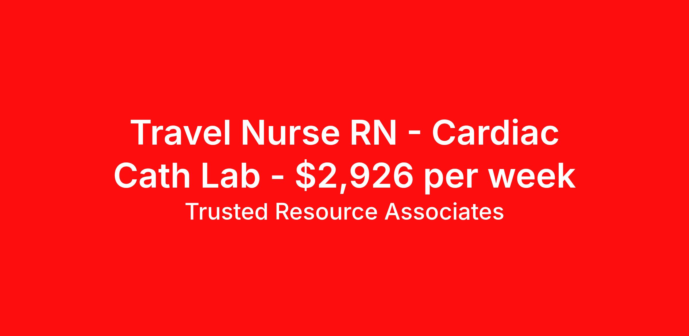 Trusted Resource Associates (TRA) is seeking a travel nurse RN Cardiac Cath Lab for a travel nursing job in Bartlett, Tennessee. Job Description & Requirements Specialty: Cardiac Cath Lab Discipline: RN Start Date: 04/01/2026 Duration: 13 weeks 40 hours per week Shift: 8 hours, days Employment Type: Travel TRA RN Cath Lab TRA is Tenet's in-house nationwide contingent pool for Nursing and Allied travel and local contracts. Receive a greater level of Contract security compared to with an outside agency. BENEFITS - Guaranteed hours for Travel Contracts - Preferred Booking Agreement for Local Contracts - Weekly Pay - Holiday Pay - Contract Security compared to a contract with an outside agency Minimum education Graduate of an accredited School of nursing Minimum Experience Must have 2 years of Acute Care nursing experience with a minimum one year current in this discipline. Required Certification/Licensure - Must be currently licensed, certified or registered to practice profession as required by law, regulation in state of practice or policy. Must meet all certification requirements for each nursing specialty supported - American Heart Association - CPR-Basic Life Support - Other credentialing items, such as a skills checklist and health related documents, which will be specified by your Recruiter. Our Hire Process - We do qualify our clinicians to meet or exceed the minimum requirements of a travel or local assignment. If you are qualified, we may direct-hire you, reducing the time we can get you to work! When you reach out to a TRA Recruiter for more details, ensure your Vivian profile includes your most updated resume! Trusted Resource Associates (TRA) Job ID 500142. Pay package is based on 8 hour shifts and 40 hours per week (subject to confirmation) with tax-free stipend amount to be determined. Benefits 401k retirement plan Weekly pay Holiday Pay Referral bonus