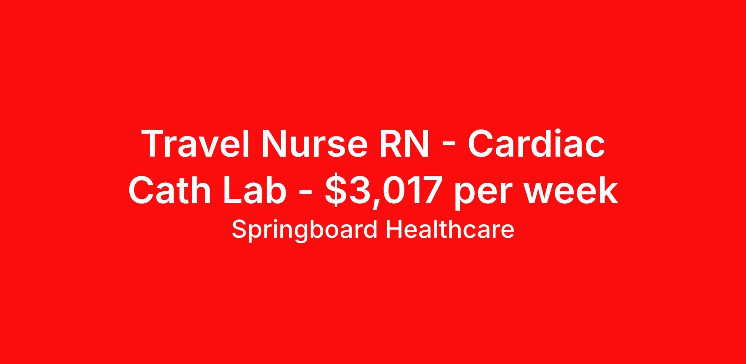 Springboard Healthcare is seeking a travel nurse RN Cardiac Cath Lab for a travel nursing job in Wilkes-Barre, Pennsylvania. Job Description & Requirements Specialty: Cardiac Cath Lab Discipline: RN Start Date: 04/20/2026 Duration: 13 weeks 40 hours per week Shift: 8 hours Employment Type: Travel Springboard Healthcare Job ID 838095. Pay package is based on 8 hour shifts and 40 hours per week (subject to confirmation) with tax-free stipend amount to be determined. Posted job title: Cath Lab RN