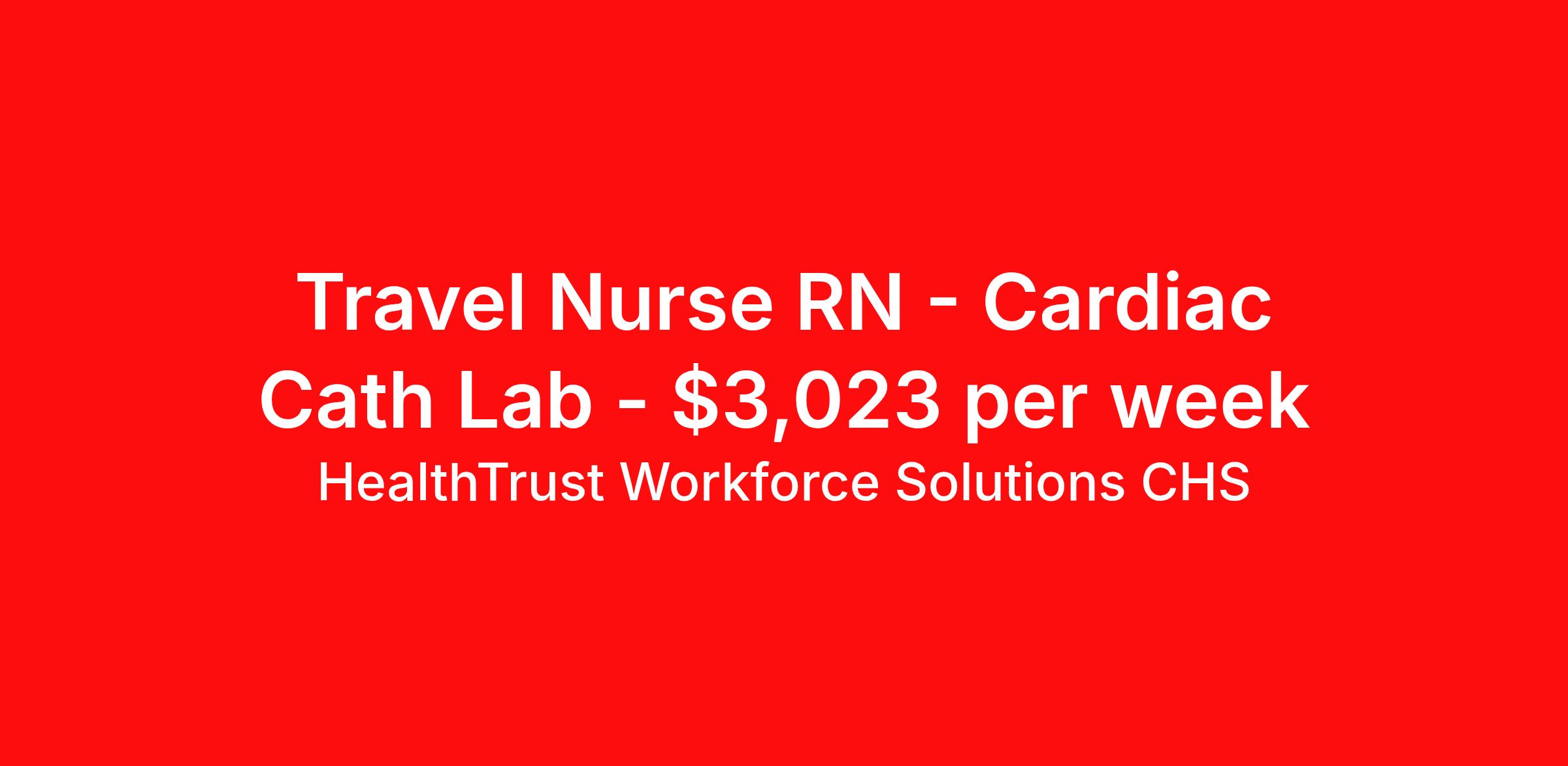 HealthTrust Workforce Solutions CHS is seeking a travel nurse RN Cardiac Cath Lab for a travel nursing job in Tucson, Arizona. Job Description & Requirements Specialty: Cardiac Cath Lab Discipline: RN Duration: 13 weeks 40 hours per week Shift: 10 hours, days Employment Type: Travel Northwest Medical Center DO NOT APPLY UNLESS START DATE IS IMMEDIATE. Cath Lab RN Start: ASAP Duration: 13 Weeks Shift: 4/10's 6a - 4:30p ONCALL Requirements: 7- 9 per month with one weekend (able to pick up more call if interested). 30 MINUTE response time to hospital for STEMI call. 36 Hrs. Guaranteed REQUIRED : ACLS/BLS Experience: at least 3 years, but will consider less Experience: Circulating, Monitoring, and familiarity with STEMI, high risk equipment, (Impella, IABP, Anari) EP & IR. Preferred Experience: Electrophysiology, and/or IR, experienced traveler Patient Ratio: 3:1 Scrubs: Provided Must be willing to Float to Northwest Houghton - 2200 S. Houghton, Rd, Tucson