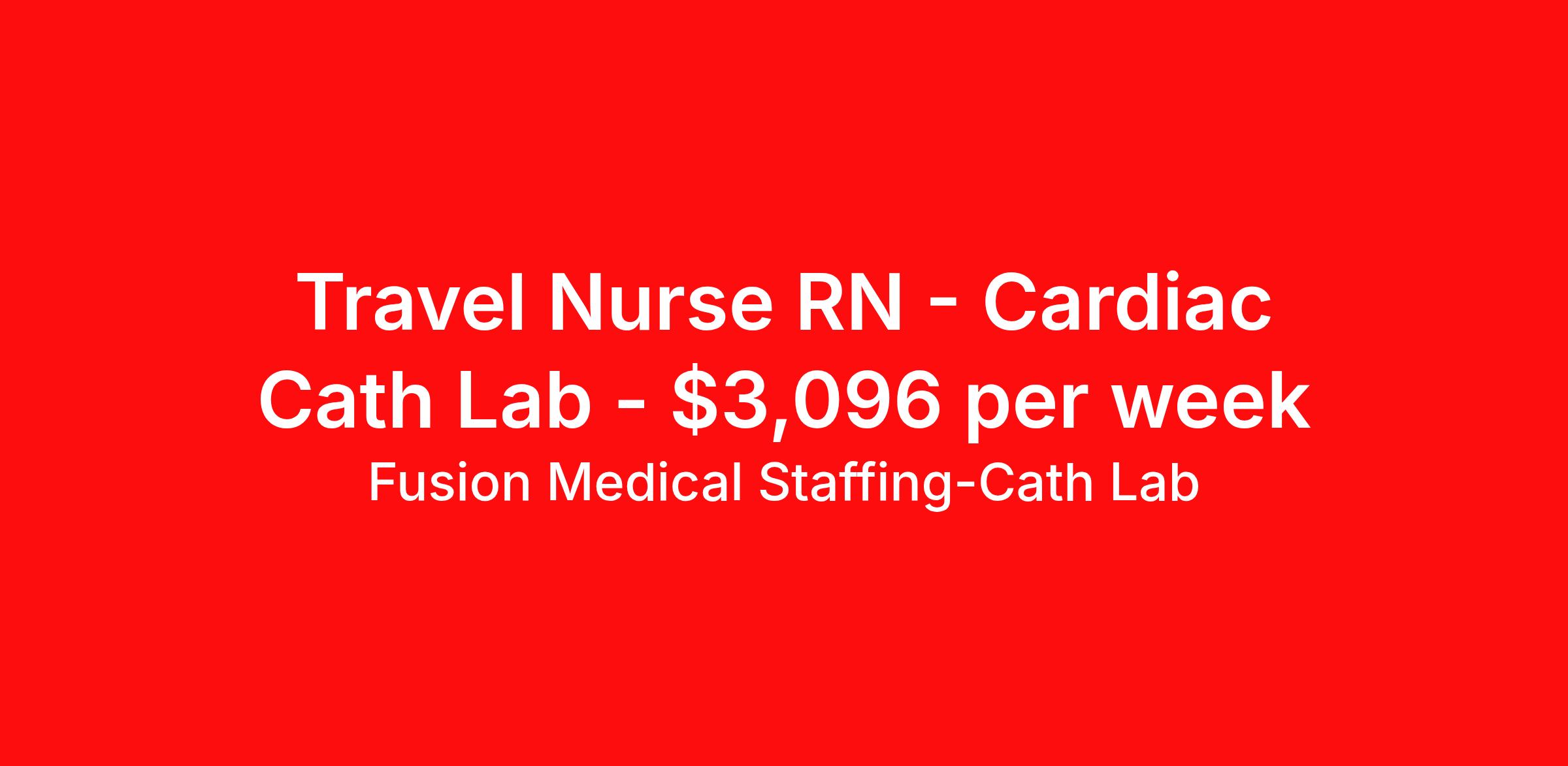 Fusion Medical Staffing-Cath Lab is seeking a travel nurse RN Cardiac Cath Lab for a travel nursing job in Los Angeles, California. Job Description & Requirements Specialty: Cardiac Cath Lab Discipline: RN Start Date: 03/30/2026 Duration: 13 weeks 40 hours per week Shift: 8 hours Employment Type: Travel Travel Cath Lab RN Company: Fusion Medical Staffing Location: Facility in Los Angeles, California Job Details Fusion Medical Staffing is seeking a skilled Cardiac Cath Lab RN for a 13-week travel assignment in Los Angeles, California. As a member of our team, you'll have the opportunity to make a positive impact on the lives of patients while enjoying competitive pay, comprehensive benefits, and the support of a dedicated clinical team. Required Qualifications: One year’s recent experience as a Cath Lab RN Valid RN license in compliance with state regulations Current BLS (AHA/ ARC) Certification Current ACLS Certification Preferred Qualifications: PALS or ENPC Certifications RCIS certification Other certifications and licenses may be required for this position Summary: The Travel Cath Lab RN provides specialized care for patients undergoing cardiac catheterization and interventional treatments. The RN prepares patients for procedures, assists during interventions, and monitors immediate post-procedure recovery. Working closely with cardiologists and cath lab teams, this role requires advanced cardiac care skills, cardiac catheterization skills, strong communication, and the ability to adapt quickly while maintaining strict safety and regulatory standards. Essential Work Functions: Conduct assessment of patients prior to procedures, including reviewing medical history and performing physical exams Assist in positioning patients correctly for the procedure and ensure EKG electrodes and cardiac leads are properly placed Assist physicians during procedures, including the placement of catheters, wires, balloons, stents, structural heart devices, and other cardiac interventions Operate and monitor hemodynamic equipment, recognizing and responding to changes in cardiac rhythms and hemodynamic waveforms Assist in arterial and/or venous sheath removal using closure devices, manual pressure, or mechanical compression, and transport patients to the appropriate recovery area Monitor vital signs, ECG, and hemodynamic parameters during cardiac catheterization and interventional procedure Support post-procedure care, including monitoring patient recovery and ensuring a smooth transition to the next phase of care Maintain and troubleshoot cath lab equipment, ensuring everything is functioning properly and fully stocked for procedures Communicate effectively with team members, patients, families, and physicians to provide seamless care Adhere to hospital safety protocols, infection control guidelines, and regulatory standards Perform other duties as assigned within the scope of practice Required Essential Skills: Critical thinking, service excellence, and good interpersonal communication skills The ability to read, write, and communicate in the English language Ability to read/comprehend written instructions, follow verbal instructions, and proficiency in PC skills Physical Abilities - Must be able to remain in a stationary position, move about, move equipment (50-100lbs), push, pull, and bend Interpersonal Skills - Must be able to work effectively with a variety of personnel (professional and ancillary) to present a positive attitude and professionalism Technical/Motor Skills - Must have the ability to grasp, perform fine manipulation, push/pull, and move about when assisting with procedures and/or using department equipment Mental Requirements - Must be able to cope with frequent contact with the general public and customers while meeting deadlines under pressure. Must be able to work under close supervision occasionally, as well as working without assistance from other personnel. Must be able to contend with irregular activity schedules occasionally and continuous concentration to detail Sensory - Must possess visual acuity and ability to effectively communicate Benefits Include: Highly competitive pay for travel professionals Comprehensive medical, dental, and vision insurance with first day coverage Paid Time Off (PTO) after 1560 hours Life and Short-term disability offered 401(k) matching Aggressive Refer-a-friend Bonus Program 24/7 recruiter support Reimbursement for licensure and CEUs Why Choose Fusion? At Fusion Medical Staffing, our goal is to improve the lives of everyone we touch, and we're always looking for people like you to join our mission. Your passion for helping others deserves a partner just as committed to supporting you — that’s why we offer day one insurance, $0 copay for mental health services, scholarships and awards, exclusive discounts, and more. From your personal recruiter to our clinical and traveler experience teams, we’re here to guide and celebrate you along your journey. You take care of others; we take care of you. Other Duties Disclaimer: To perform this job successfully, an individual must be able to perform each essential duty satisfactorily. The requirements listed are representative of the knowledge, skill, and/or ability required. Reasonable accommodations may be made to enable individuals with disabilities to perform the essential functions. Other duties may be assigned. This job description is not a comprehensive list of all activities, duties, or responsibilities that are required of the employee for this job and is subject to change at any time with or without notice. Start your rewarding career as a Travel Cath Lab RN with Fusion Medical Staffing and join our mission to improve lives. Apply now! *Fusion is an EOE/E-Verify Employer Fusion Medical Staffing - Cath Lab Job ID 1882153. Pay package is based on 8 hour shifts and 40 hours per week (subject to confirmation) with tax-free stipend amount to be determined. About Fusion Medical Staffing-Cath Lab W