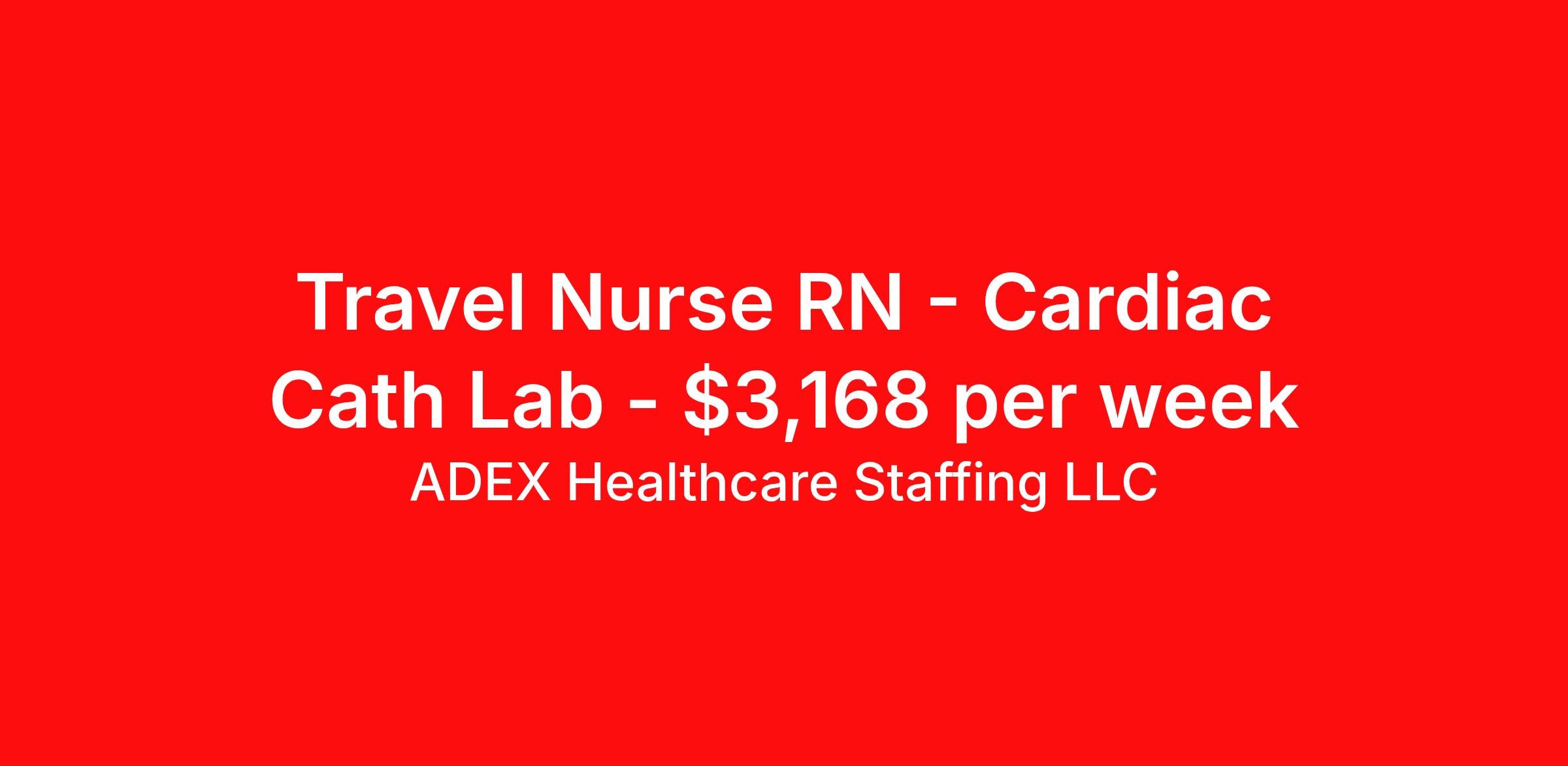 ADEX Healthcare Staffing LLC is seeking a travel nurse RN Cardiac Cath Lab for a travel nursing job in Modesto, California. Job Description & Requirements Specialty: Cardiac Cath Lab Discipline: RN Start Date: 03/30/2026 Duration: 13 weeks 40 hours per week Shift: 8 hours, days Employment Type: Travel RN Position Job Notes: Travel or Local Registered Nurse needed for ASAP start. A minimum of 2 years of recent hospital bedside experience is required. Candidates must be able to start within 5 weeks. Opportunity for extension upon successful completion of the initial assignment. $750 referral bonus available. Opportunity: RN - Cath Lab Job Details: • Patient care ratios of 3:1 for step-down and 4:1 for telemetry units • Full responsibility for patient care rests with nursing staff • All travelers must report to facility location at 7:00 AM on start date • HR onboarding location is across the street at 1400 Florida Ave Suite 202 • Dedicated parking available at HR location (do not use hospital parking) • HR office hours are 7:30 AM to 3:30 PM • Work in cardiac catheterization laboratory providing specialized nursing care • Support patients undergoing cardiac procedures and interventions Facility: This medical center provides comprehensive healthcare services including specialized cardiac care through their catheterization laboratory. The facility maintains high standards for patient care with structured nurse-to-patient ratios and emphasizes the critical role of nursing staff in patient outcomes. The organization offers convenient onboarding processes with dedicated HR facilities and parking to support healthcare professionals. Location: Modesto, CA Modesto is located in California's Central Valley, offering an affordable cost of living with proximity to both San Francisco and Lake Tahoe. The city provides a perfect balance of suburban living with access to outdoor recreation, cultural attractions, and major metropolitan areas within driving distance. Adex Job ID 28164. Pay package is based on 8 hour shifts and 40 hours per week (subject to confirmation) with tax-free stipend amount to be determined. About ADEX Healthcare Staffing LLC ADEX has been placing healthcare professionals across the US since 2004. Originally founded in Atlanta, GA, the company's headquarters are now located in Tampa, FL. JCAHO certified since 2009. Benefits Referral bonus
