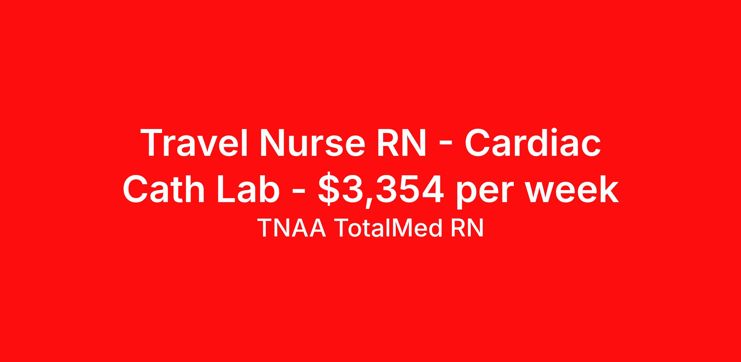 TNAA TotalMed RN is seeking a travel nurse RN Cardiac Cath Lab for a travel nursing job in Rockford, Illinois. Job Description & Requirements Specialty: Cardiac Cath Lab Discipline: RN Duration: 13 weeks 40 hours per week Shift: 10 hours, days Employment Type: Travel About TNAA TotalMed RN TotalMed is a Top Ten, travel nursing and healthcare staffing agency with the mission of igniting purpose in healthcare. The organization staffs nurses, therapists, pharmacists, and other clinicians of all specialties in all 50 states. They offer local and travel jobs and match caregivers with the right organization to assist both facilities and patients. As an organization, they focus on putting highly-skilled staff into facilities to ensure adequate staffing for a better patient experience. TotalMed specializes in recruiting and placing healthcare professionals in travel, PRN, and permanent positions across the country in Nursing and Allied Health. Throughout 2020, the organization filled roles at even the most short-staffed facilities during the most challenging time in healthcare. By matching the right travel healthcare professional with the right organization, TotalMed continues to offer a lifeline to facilities and their patients. Benefits Weekly pay Guaranteed Hours Continuing Education 401k retirement plan Sick pay Wellness and fitness programs Referral bonus Employee assistance programs Medical benefits Dental benefits Vision benefits Benefits start day 1