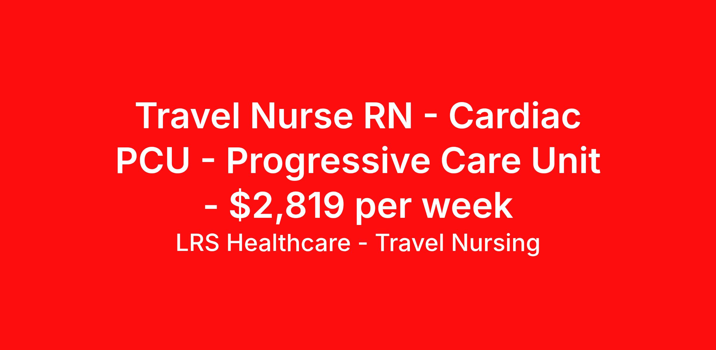 LRS Healthcare - Travel Nursing is seeking a travel nurse RN Cardiac PCU - Progressive Care Unit for a travel nursing job in Evansville, Indiana. Job Description & Requirements Specialty: Cardiac PCU - Progressive Care Unit Discipline: RN Duration: 13 weeks 48 hours per week Shift: 12 hours, nights Employment Type: Travel LRS Healthcare - Travel Nursing Job ID 031826-D. Pay package is based on 12 hour shifts and 48 hours per week (subject to confirmation) with tax-free stipend amount to be determined. About LRS Healthcare - Travel Nursing LRS Healthcare can lend a hand to take your career to new heights and places. As an industry leader in healthcare staffing, we work to connect you with jobs at top of the line facilities in the locations you’ve always wanted to live and visit. LRS is truly a full service medical staffing agency, so we take care of everything from housing and travel expenses to your itinerary, too. We handle it all because we want to be with you throughout your journey – not just your next placement. As a medical staffing agency that fosters long relationships with their employees, we’re determined to help amplify your personal and career growth through placement. We identify both temporary and permanent positions for candidates, and even some temp-to-perm positions that begin as 13-week programs. We have many positions available across the country, so let's discuss what would be a good fit for you! Benefits: Medical, Dental, and Vision Short-Term Disability Long-Term Disability Life Insurance 401(k) Certification & License Reimbursement Refer-a-friend Bonus Program Direct Deposit - Weekly 24-Hour Support Benefits Medical benefits Life insurance 401k retirement plan License and certification reimbursement Referral bonus Weekly pay