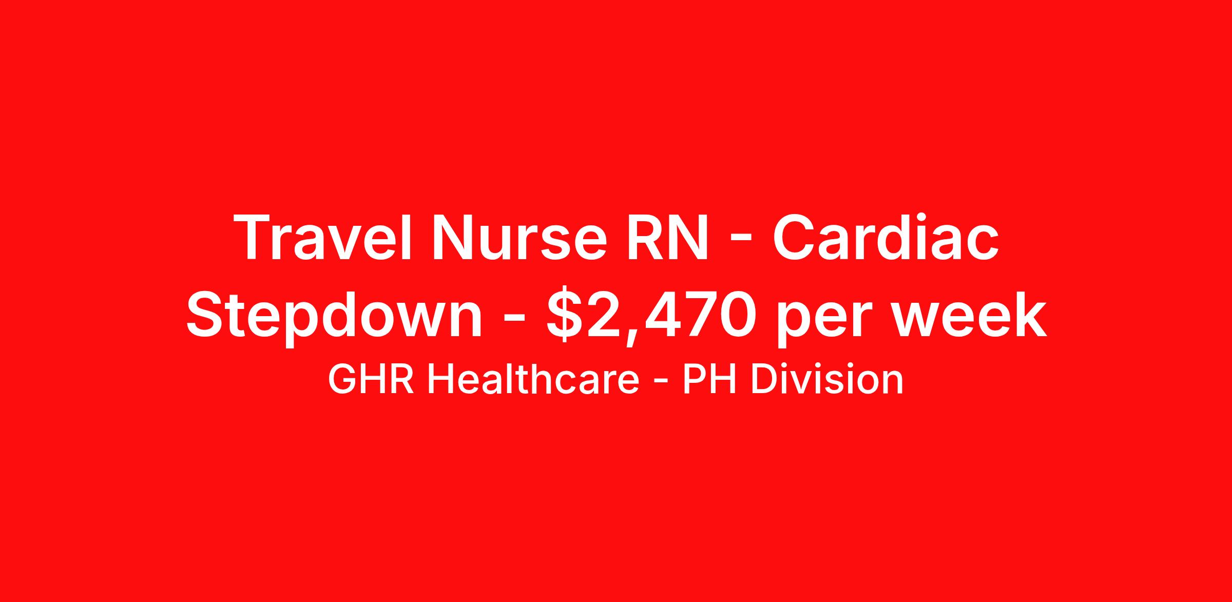 GHR Healthcare - PH Division is seeking a travel nurse RN Cardiac Stepdown for a travel nursing job in Morgantown, West Virginia. Job Description & Requirements Specialty: Cardiac Stepdown Discipline: RN Start Date: 04/13/2026 Duration: 13 weeks 36 hours per week Shift: 12 hours, nights Employment Type: Travel Unit Notes Submission Requirements: Can only submit to 1 position at a time across the entire WVU system Drivers license address must be outside 50 miles from the facility Previous perm candidates must be gone for 2 years Previous travelers there for 1 full year must be gone for 2 years Individual unit requirements listed in pulse apply. Travel teams must be submitted together in 1 email We are only permitted to submit 2 candidates per opening, if the position is at max, we will hold on to the submission if a spot opens up *ALL SUBMITTALS MUST INCLUDE A UNEXPIRED COPY OF THE CANDIDATES DRIVES LICENSE* COVID VACCINE REQUIRED: Fully vaccinated means either 2 shots of Moderna or Pfizer or 1 shot of J&J; If a traveler wants to decline based on a Medical or Religious reason, please have them fill out the appropriate Exemption Form and email it to the address on the form. These should be done ASAP as they have to go through a council to be approved or denied Unit "7 EAST - Trauma & General Surgery Inpatient Unit. Also a Nationally recognized Comprehensive Bariatric Surgery Center (This unit is Stepdown & Floor)" of beds 30-33 Total Beds (12-15 Floor, 18 Stepdown) Ratios 1:6 for Floor patients, 1:3 for Stepdown patients Required Certifications BLS is required Common diagnoses/Types of patients Multi-trauma, TBI, Fractures, General Surgery (choles, ostomies, etc.); Bariatric Surgery – Other typical Med-Surg as needed Experience or 'Must have' skills Must have experience with complex wound care, drains, devices, traumatic injuries, Chest tubes, respiratory support, TBI's, complex spinal cord injuries, as well as other medical & surgical conditions. Are RNs required to titrate drips? Unknown Common titratable &/or set rate drips "Floor - Heparin, PCA's Stepdown - Insulin, Cardizem, etc. (non-pressers)" Charge Nurse/House Supervisor Budgeted Free Charge Nurse 24/7 - House Supervisor available Are there nurse aids on this unit/Ratios Called 'Clinical Associates' will have 4 when fully staffed RT Equipment (vents, Cpap, BiPap, etc.) RT available 24/7 - They do have stable/chronic vents only Is there tele on this unit? Monitor techs? RNs read strips? Yes - they do have monitor techs who will read/run, & monitor; however, the RN must be able to validate, so they will need to be able to read strips. Shifts & Scheduling 7a-7:30p; 7p-7:30a Weekend Requirement Every weekend night shift Holiday Requirement Yes - will work into the perm staff holiday schedule as needed Is there a call or standby requirement? Unknown Floating Requirement Floating to like units is required (floor/stepdown) Scrub Color/Dress code Royal Blue Unit/Department specific orientation Please confirm Additional Notes "33-bed Trauma and General Surgery inpatient unit. We are a high-impact, fast-paced nursing unit that works with challenging patient-care issues allowing nurses to practice at the top of their scope and abilities. On 7 East we encounter a variety of patient conditions and care modalities. We see complex wound care with a variety of drains and devices, traumatic injuries, including chest-wall injuries requiring chest-tubes and respiratory support, traumatic brain injuries presenting their own complex challenges, and complex spinal cord injuries as well as other medical and surgical conditions that our patients experience. 7 East nurses work collaboratively with care management, surgical and medical services, rehabilitation services and perioperative services. 7 East is also a nationally-recognized Comprehensive Bariatric Surgery Center, working with patients undergoing Bariatric weight-loss surgeries and experiencing the renewal that can provide those patients. 7 East has both step-down and floor patients allowing nurses to experience two levels of care, the breadth and time-management of the floor, and the depth and critical thinking of the step-down. We maintain a ratio of 1:6 for the floor and 1:3 for the Step-down. About GHR Healthcare - PH Division For over 30 years, GHR Healthcare has been the bridge between healthcare professionals and the facilities that need them nationwide. We're committed to uncovering your ideal fit, supported by GHR's dedication to competitive compensation, transparent communication, and a devoted team that genuinely cares about your career journey. You can trust us to stand by your side as your advocate, confidante, and partner in advancing your career. At GHR, care and consideration are at the heart of everything we do. Visit ghrhealthcare.com to learn more.