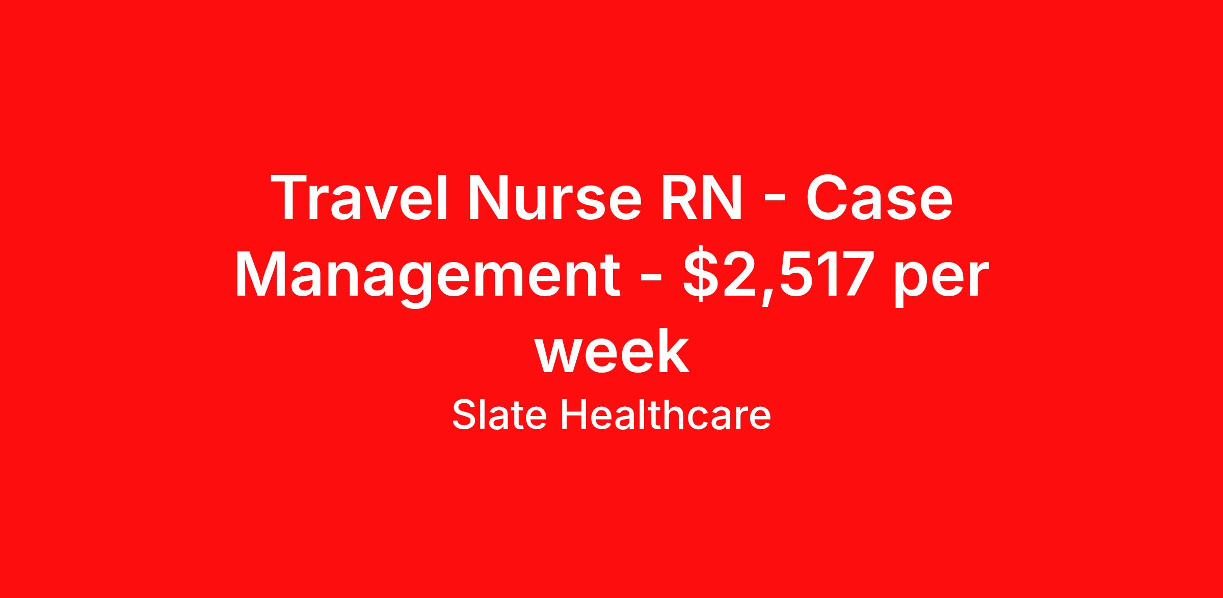 Slate Healthcare is seeking a travel nurse RN Case Management for a travel nursing job in Rapid City, South Dakota. Job Description & Requirements Specialty: Case Management Discipline: RN Start Date: 04/20/2026 Duration: 13 weeks 40 hours per week Shift: 8 hours, days Employment Type: Travel Profession:RN, JobSpecialty:Case Management, Shift:5x8 Days, Duration:13 weeks Slate Healthcare Job ID bda8e4e8-d523-433e-8d82-1f0c1ed28bbe. Pay package is based on 8 hour shifts and 40 hours per week (subject to confirmation) with tax-free stipend amount to be determined. About Slate Healthcare Slate Healthcare is a premier travel healthcare staffing agency, connecting healthcare professionals with thousands of opportunities at top-tier hospitals and facilities across the country. We’re committed to supporting nurses and allied health professionals in building stable, fulfilling careers—while embracing the freedom and excitement that comes with travel. Our goal is simple: to offer flexibility, competitive pay, and personalized placements that align with each clinician’s lifestyle and career goals. At Slate, we empower our professionals to choose when and where they work, while ensuring they receive the highest compensation possible—because we believe that exceptional care starts with empowered caregivers.