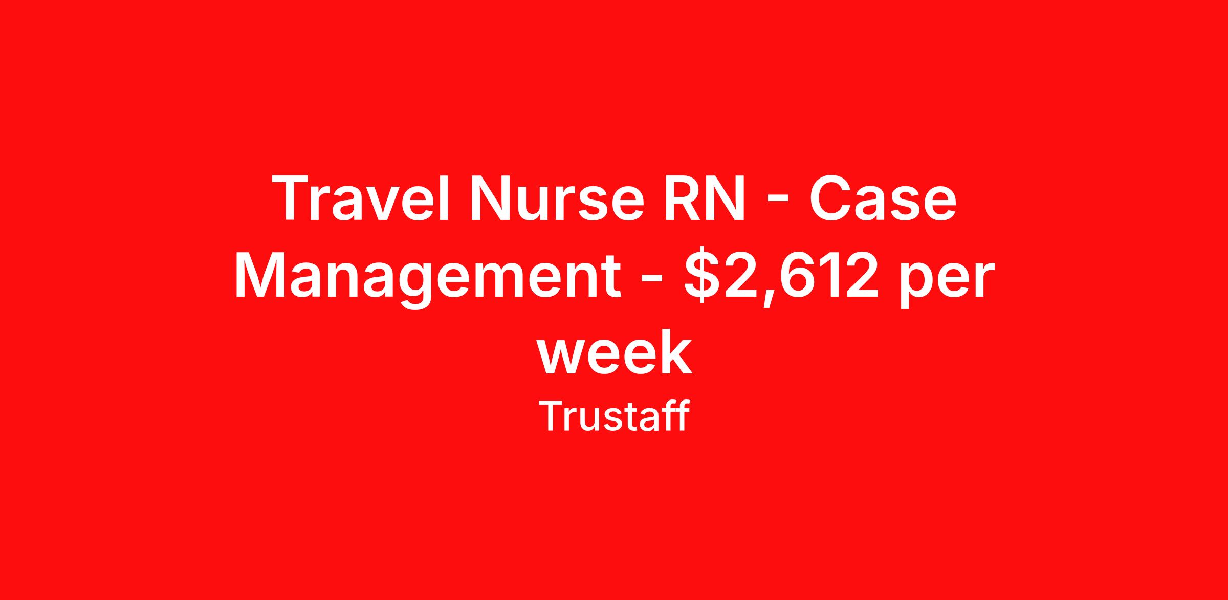 Trustaff is seeking a travel nurse RN Case Management for a travel nursing job in Irvine, California. Job Description & Requirements Specialty: Case Management Discipline: RN Start Date: 04/06/2026 Duration: 13 weeks 40 hours per week Shift: 8 hours, days Employment Type: Travel As a Case Management RN, you'll develop, implement, and evaluate individual patient care plans. You'll work with patients one-on-one to manage their care appropriately and affordably. Case Managers are important liaison, and you'll serve as a link between patients, their families, and healthcare providers. Trustaff Job ID 972126. Pay package is based on 8 hour shifts and 40 hours per week (subject to confirmation) with tax-free stipend amount to be determined. Posted job title: Case Management About Trustaff Our nurse-first attitude has set us apart from other travel nursing agencies When you join the Trustaff family, you’re more than just a body filling a role—you're a vibrant individual with dreams and aspirations. As one of the nation's leading travel nursing companies, your recruiter will work with you one-on-one to guide your career and help you achieve your goals. You decide when and where you want to work Enjoy industry-leading pay, benefits, and bonuses Experience new people and places Grow your clinical skills and expand your experience Travel nursing lets you take your professional career to the next level while maintaining your flexibility and freedom. At Trustaff, we put you first, so you never have to compromise your work or pay. We are proud to have one of the highest nurse retention rates in the country. Some of the other reasons people choose us include: Priority access to thousands of travel nursing jobs Industry-leading pay Guaranteed weekly hours Experienced recruiters Comprehensive benefits, including medical, dental, and vision 401k with employer match Assistance with travel, compliance, and housing Great bonuses for completions, referring friends, and more Benefits Weekly pay Guaranteed Hours Wellness and fitness programs Referral bonus Medical benefits Dental benefits Vision benefits