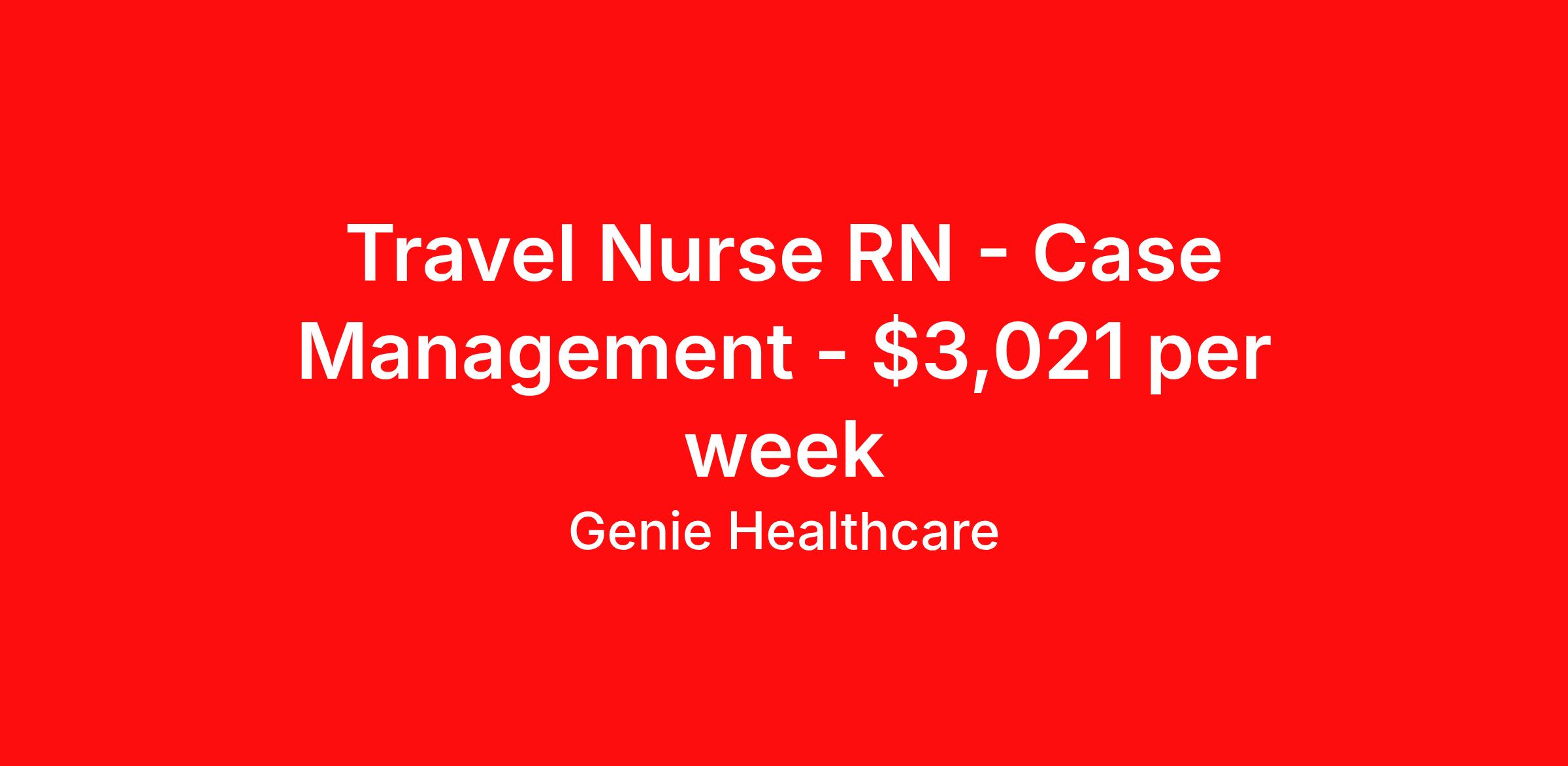 Genie Healthcare is seeking a travel nurse RN Case Management for a travel nursing job in Santa Rosa, California. Job Description & Requirements Specialty: Case Management Discipline: RN Start Date: 04/13/2026 Duration: 13 weeks 40 hours per week Shift: 8 hours, days Employment Type: Travel Genie Healthcare is looking for a RN to work in Case Manager for a 12.71 weeks travel assignment located in Santa Rosa, CA for the Shift (5x8 Days - Please verify shift details with recruiter, 07:00:00-15:00:00, 8.00-5). Pay and benefits packages are estimated based on client bill rate at time the job was posted. These rates are subject to change. Exact pay and benefits vary based on several things, including, but not limited to, guaranteed hours, client changes in bill rate, experience, etc. Benefits: Medical Insurance, Dental Insurance, Vision Insurance, 401(k) with company matching (50% up to 6% of what you contribute) Genie Healthcare Job ID 17995483. Pay package is based on 8 hour shifts and 40.0 hours per week (subject to confirmation) with tax-free stipend amount to be determined. Posted job title: RN:Case Manager,07:00:00-15:00:00 About Genie Healthcare Genie Healthcare is one of the fastest growing Nurse Travel Agencies in the USA. Genie serves hundreds of facilities and has over 4000 current travel RN contracts open at any given time. Genie provides travel RN’s flexibility, support, top pay scale, housing and the 1 rated, multi-state health insurance coverage. Genie Healthcare carries with it a commitment to providing a comprehensive level of service and quality care. Growing from a small team of eager recruiters to a company with satisfied clients in nearly every corner of the nation, delivering excellence in patient and customer care is the key to Genie’s success. The management team has 20 years of experience in workforce solutions and staffing in medical and non-medical fields, roles ranging from Clerical job to Cardiologist to software developer to CEO.