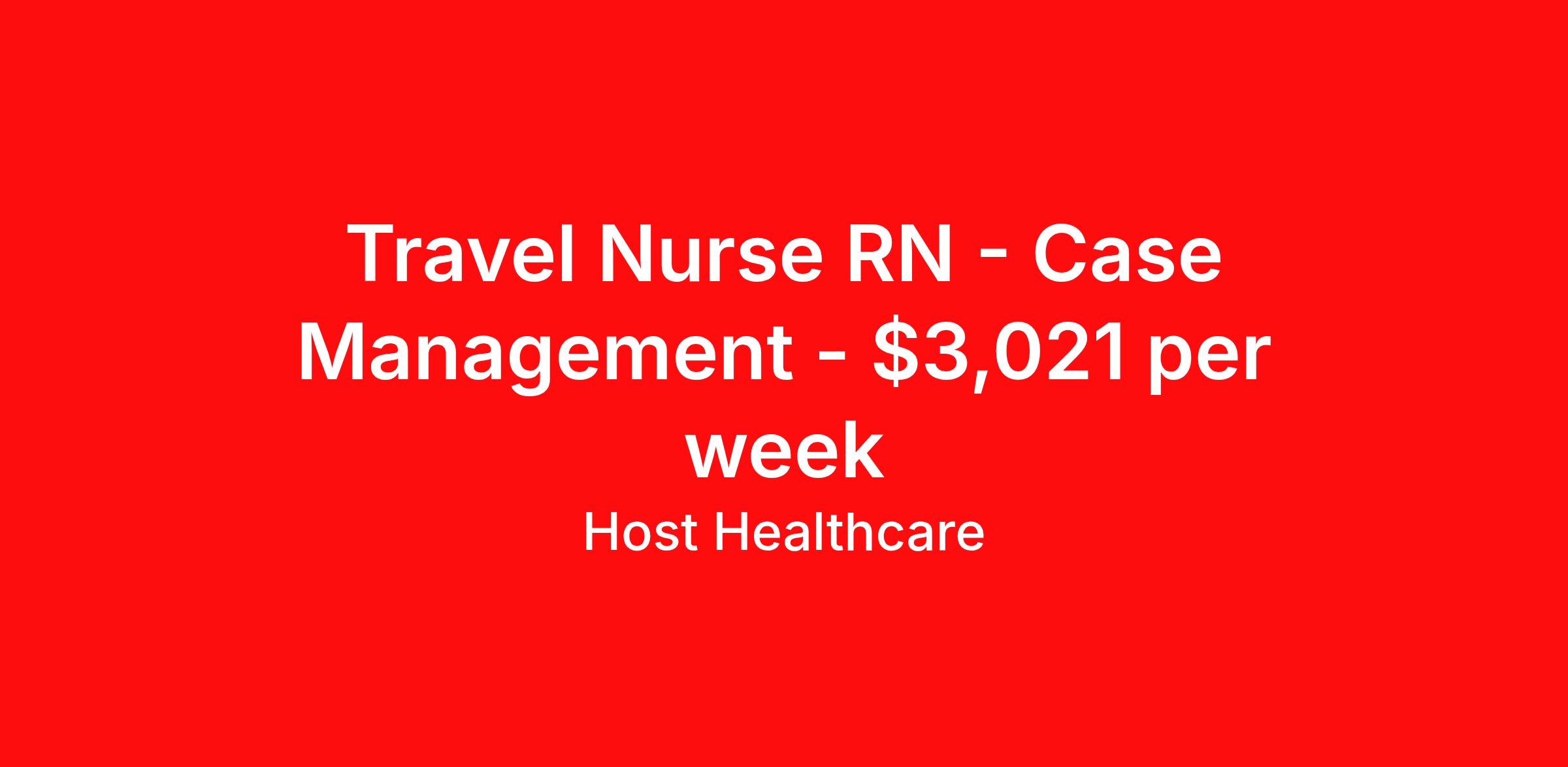 Host Healthcare is seeking a travel nurse RN Case Management for a travel nursing job in Concord, California. Job Description & Requirements Specialty: Case Management Discipline: RN Start Date: 04/21/2026 Duration: 13 weeks 40 hours per week Shift: 8 hours, days Employment Type: Travel Host Healthcare Job ID a1fVX000002xtFSYAY. Pay package is based on 8 hour shifts and 40 hours per week (subject to confirmation) with tax-free stipend amount to be determined. Posted job title: RN - Case Management About Host Healthcare At Host Healthcare, we provide a truly comfortable experience as you explore your travel nursing, therapy, or allied career. We make your travel healthcare journey easy by taking care of all the details, so you don’t have to. We are on a mission to help others live better and we do this by helping the healers of the world be as comfortable as possible. With access to tens of thousands of travel nursing, therapy, and allied jobs in all 50 states, our responsive and friendly recruiters find your dream position based on what’s important to you. During your assignment, get access to premium benefits, including Day 1 medical that continues up to 30 days between assignments, 401K matching, travel reimbursements, dedicated housing support, and more. We also offer 24/7 support from our team and access to our on-staff clinicians so you can feel comfortable and confident throughout your entire assignment. Travel comfortably with Host Healthcare. Benefits Referral bonus School loan reimbursement Vision benefits Wellness and fitness programs Company provided housing options License and certification reimbursement Life insurance Medical benefits Mileage reimbursement Pet insurance Discount program Employee assistance programs Guaranteed Hours Health savings account Holiday Pay 401k retirement plan Continuing Education Dental benefits