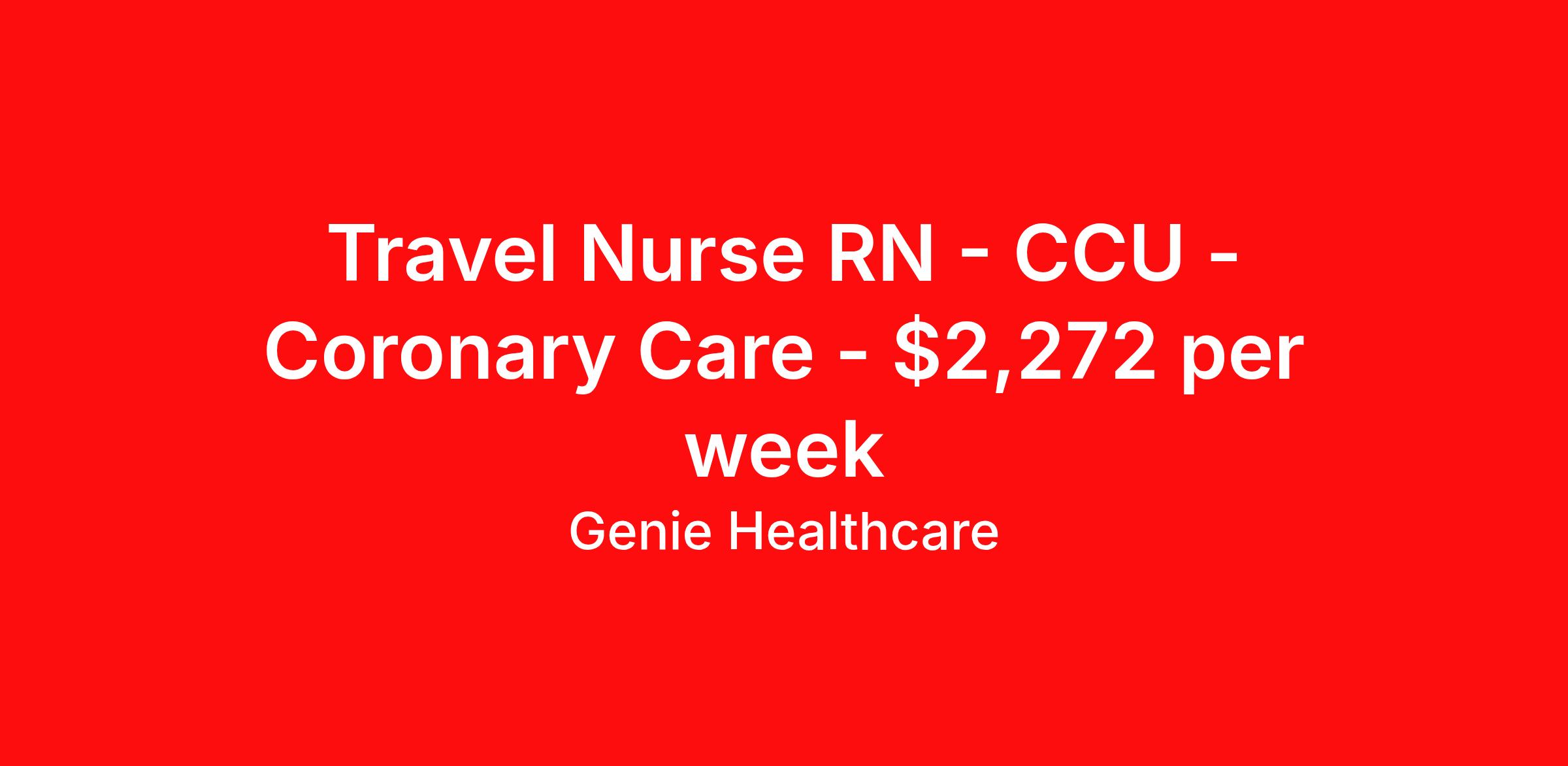 Genie Healthcare is seeking a travel nurse RN CCU - Coronary Care for a travel nursing job in Geneva, New York. Job Description & Requirements Specialty: CCU - Coronary Care Discipline: RN Start Date: 03/30/2026 Duration: 14 weeks 36 hours per week Shift: 12 hours, nights Employment Type: Travel Genie Healthcare is looking for a RN to work in CCU - Coronary Care for a 13.71 weeks travel assignment located in Geneva General Hospital | 196 North St, Geneva, NY for the Shift (3x12 nights, 19:00:00-07:00:00, 12.00-3). Pay and benefits packages are estimated based on client bill rate at time the job was posted. These rates are subject to change. Exact pay and benefits vary based on several things, including, but not limited to, guaranteed hours, client changes in bill rate, experience, etc. Benefits: Medical Insurance, Dental Insurance, Vision Insurance, 401(k) with company matching (50% up to 6% of what you contribute) Genie Healthcare Job ID 17904948. Pay package is based on 12 hour shifts and 36.0 hours per week (subject to confirmation) with tax-free stipend amount to be determined. Posted job title: RN:CCU - Coronary Care,19:00:00-07:00:00 About Genie Healthcare Genie Healthcare is one of the fastest growing Nurse Travel Agencies in the USA. Genie serves hundreds of facilities and has over 4000 current travel RN contracts open at any given time. Genie provides travel RN’s flexibility, support, top pay scale, housing and the 1 rated, multi-state health insurance coverage. Genie Healthcare carries with it a commitment to providing a comprehensive level of service and quality care. Growing from a small team of eager recruiters to a company with satisfied clients in nearly every corner of the nation, delivering excellence in patient and customer care is the key to Genie’s success. The management team has 20 years of experience in workforce solutions and staffing in medical and non-medical fields, roles ranging from Clerical job to Cardiologist to software developer to CEO.