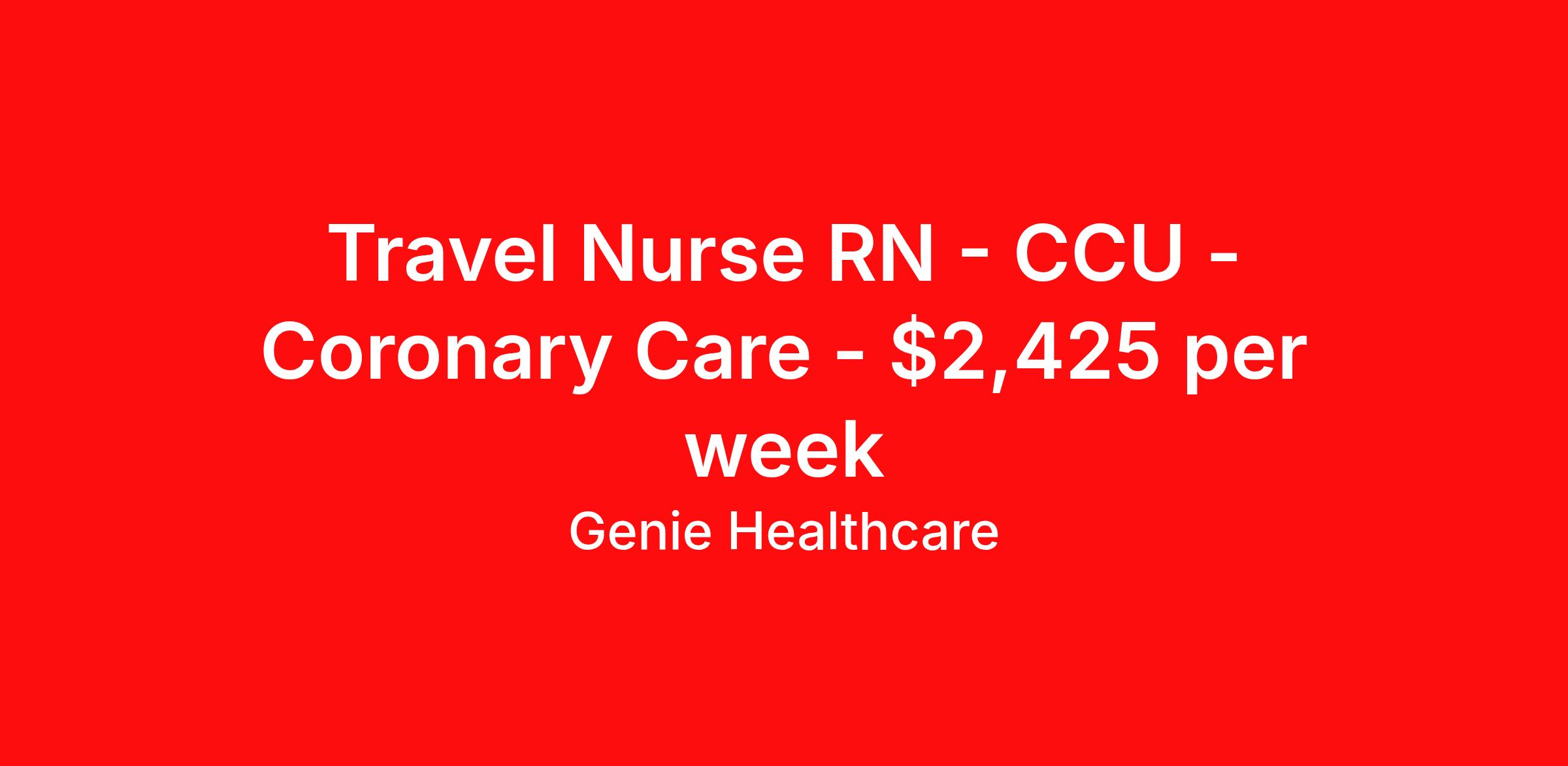 Genie Healthcare is seeking a travel nurse RN CCU - Coronary Care for a travel nursing job in Lebanon, New Hampshire. Job Description & Requirements Specialty: CCU - Coronary Care Discipline: RN Start Date: 04/13/2026 Duration: 13 weeks 36 hours per week Shift: 12 hours, nights Employment Type: Travel Genie Healthcare is looking for a RN to work in CCU - Coronary Care for a 12.71 weeks travel assignment located in Lebanon, NH for the Shift (3x12 nights, 19:00:00-07:00:00, 12.00-3). Pay and benefits packages are estimated based on client bill rate at time the job was posted. These rates are subject to change. Exact pay and benefits vary based on several things, including, but not limited to, guaranteed hours, client changes in bill rate, experience, etc. Benefits: Medical Insurance, Dental Insurance, Vision Insurance, 401(k) with company matching (50% up to 6% of what you contribute) Genie Healthcare Job ID 17715729. Pay package is based on 12 hour shifts and 36.0 hours per week (subject to confirmation) with tax-free stipend amount to be determined. Posted job title: RN:CCU - Coronary Care,19:00:00-07:00:00 About Genie Healthcare Genie Healthcare is one of the fastest growing Nurse Travel Agencies in the USA. Genie serves hundreds of facilities and has over 4000 current travel RN contracts open at any given time. Genie provides travel RN’s flexibility, support, top pay scale, housing and the 1 rated, multi-state health insurance coverage. Genie Healthcare carries with it a commitment to providing a comprehensive level of service and quality care. Growing from a small team of eager recruiters to a company with satisfied clients in nearly every corner of the nation, delivering excellence in patient and customer care is the key to Genie’s success. The management team has 20 years of experience in workforce solutions and staffing in medical and non-medical fields, roles ranging from Clerical job to Cardiologist to software developer to CEO.