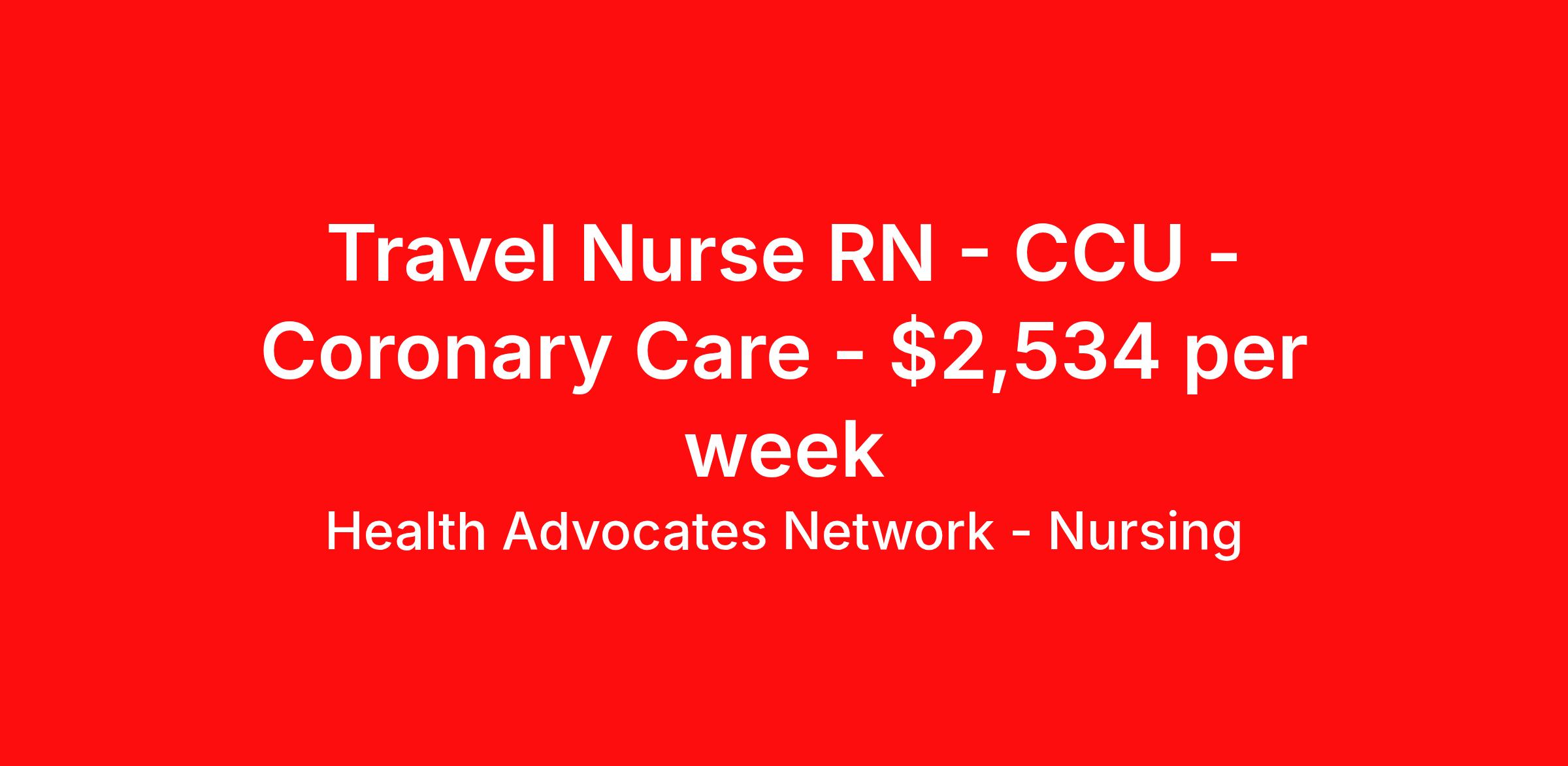 Health Advocates Network - Nursing is seeking a travel nurse RN CCU - Coronary Care for a travel nursing job in Lebanon, New Hampshire. Job Description & Requirements Specialty: CCU - Coronary Care Discipline: RN Start Date: 04/13/2026 Duration: 12 weeks 36 hours per week Shift: 12 hours, nights Employment Type: Travel HANStaff Job ID 515591. Pay package is based on 12 hour shifts and 36 hours per week (subject to confirmation) with tax-free stipend amount to be determined. Posted job title: RN - CCU About Health Advocates Network - Nursing Health Advocates Network was founded on the basis of a shared aspiration, to improve the way healthcare staffing is done. We are a company established and led by nurses. Our flexible approach enables us to develop solutions customized to your specific needs. From short- and long-term travel contracts to local and per diem assignments and more, we are here to get you to your next adventure! By solving challenges, providing the best placements, and advocating for you, we stand to help you thrive and pave the path forward in your career. Click on the videos below to learn more about our values!
