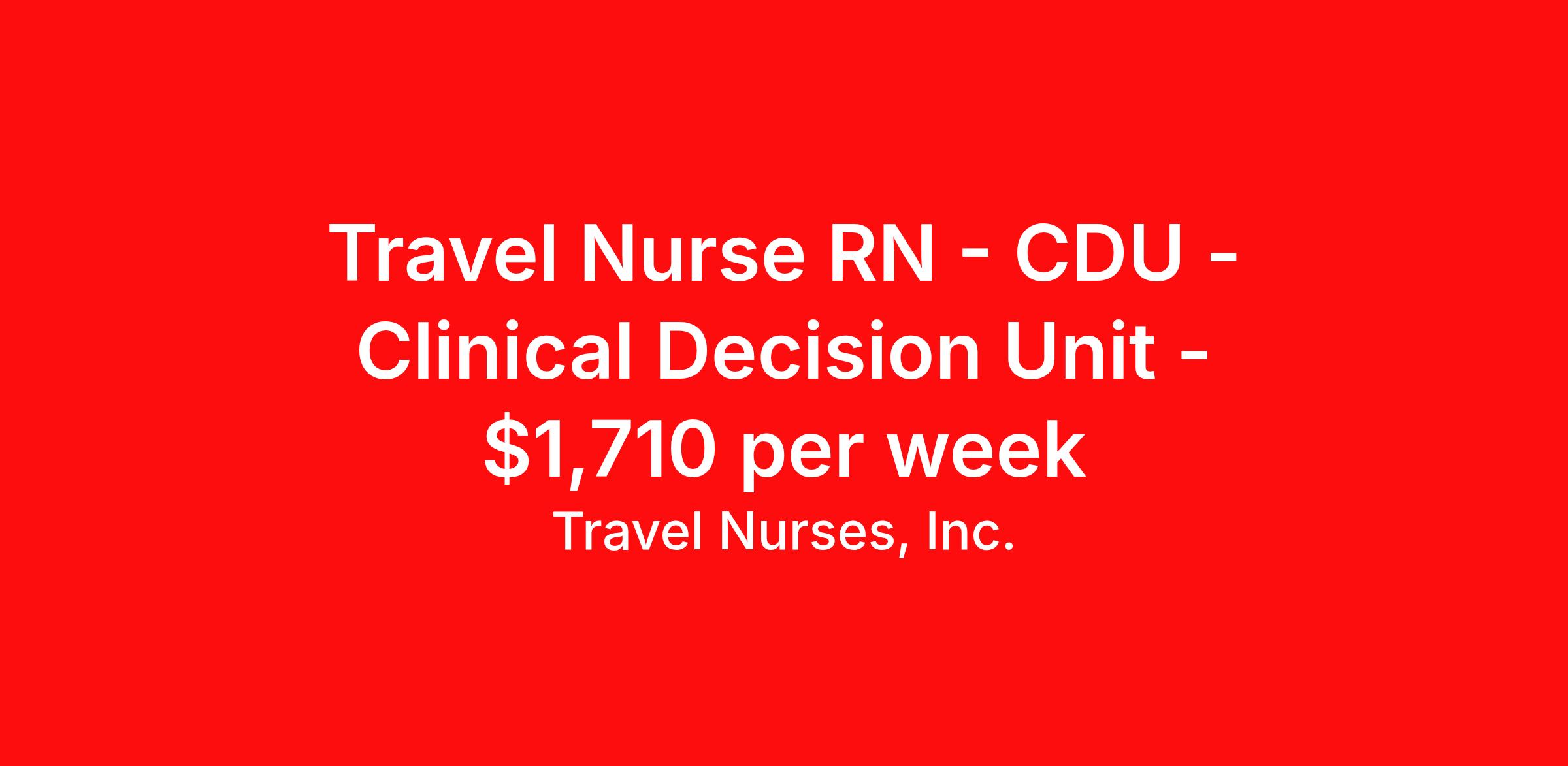 Travel Nurses, Inc. is seeking a travel nurse RN CDU - Clinical Decision Unit for a travel nursing job in Asheville, North Carolina. Job Description & Requirements Specialty: CDU - Clinical Decision Unit Discipline: RN Start Date: ASAP Duration: 13 weeks 36 hours per week Shift: 12 hours Employment Type: Travel Travel Nurses, Inc. is a nurse-founded staffing agency built on transparency and trust. We are seeking an experienced registered nurse for a travel assignment. This position is ideal for clinicians who meet distance requirements and are ready to provide excellent patient care in a rewarding environment. The onboarding process you deserve: Our recruiters make the travel process simple from start to finish. Before every contract, clinicians complete an engagement letter review that outlines pay packages, compliance and expectations. With a dedicated recruiter and clinical support available 24/7, you can focus on caring for patients while we handle the rest. Qualifications: ~One to two years of recent experience in the posted specialty ~Active state or compact registered nurse license ~Basic Life Support (BLS) and specialty-specific certifications required Benefits: ~Competitive compensation and stipends ~Day-one medical, dental and vision coverage ~401(k) plan ~Paid onboarding requirements ~Nurse referral bonus program ~Dedicated recruiter and clinical support 24/7 ~Exclusive travel contract opportunities Pay and compensation: Pay varies by facility and location. Equal opportunity statement: Travel Nurses, Inc. is committed to diversity, equity and inclusion at every level. Travel Nurses, Inc. Job ID 303785. Pay package is based on 12 hour shifts and 36 hours per week (subject to confirmation) with tax-free stipend amount to be determined. Posted job title: BACKFILL - TRAVEL - RN - D2 - PCU - CLINICAL DECISION UNIT (648) 6:45AM - 7:15PM About Travel Nurses, Inc. Travel Nurses, Inc. is a leading healthcare staffing agency that provides healthcare professionals with opportunities to work across the country. Founded by nurses in 1988, TNI has more than 30 years of experience in the industry. The agency initially focused on staffing operating room settings in the MidSouth. However, this quickly evolved to encompass all nursing specialties and allied health fields nationwide. At the heart of our mission is a profound respect for nurses, whom we consider the cornerstone of healthcare. This acknowledgment extends beyond the nursing profession alone. Travel Nurses, Inc. now proudly embraces a wide array of healthcare professionals, recognizing their crucial roles in our collective mission. Travel Nurses, Inc. is dedicated to providing comprehensive support and opportunities that will help facilitate complete career mobility in the healthcare field. Our commitment to transparency ensures that all professionals, not just nurses, can confidently accept any assignment without financial uncertainties. We prioritize our professionals’ well-being with comprehensive benefits packages, including day-one healthcare coverage, competitive salaries, bonuses and incentives. This underscores our unwavering commitment to offering the best possible rewards and support for all the professionals we serve. Benefits Weekly pay Continuing Education 401k retirement plan Wellness and fitness programs Mileage reimbursement Referral bonus Employee assistance programs Medical benefits Dental benefits Vision benefits Benefits start day 1 License and certification reimbursement Life insurance Retention bonus