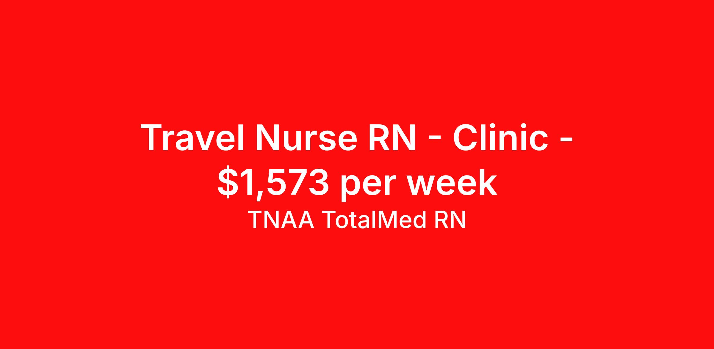 TNAA TotalMed RN is seeking a travel nurse RN Clinic for a travel nursing job in Decatur, Georgia. Job Description & Requirements Specialty: Clinic Discipline: RN Start Date: 04/20/2026 Duration: 13 weeks 40 hours per week Shift: 8 hours, days Employment Type: Travel We're looking for Registered Nurses (RNs) for an immediate travel opening in Decatur, GA. The right RN should have 1 year of experience in a Clinic or Outpatient setting. Read below for more requirements. As an RN in a Clinic, you will provide nursing care and support to patients receiving outpatient services. You'll work closely with physicians, nurse practitioners, and other healthcare staff to ensure efficient, safe, and compassionate care. As an RN, you should be prepared to perform the following tasks: Take patient histories, vital signs, and perform assessments Administer medications, injections, and vaccinations as ordered Assist providers with minor procedures and diagnostic testing Educate patients on treatment plans, medications, and preventive care Perform wound care and basic lab work, including specimen collection Monitor patient progress and communicate concerns to providers Document nursing care and patient interactions accurately Coordinate patient flow and ensure exam rooms are clean and well-stocked Follow infection control, safety, and HIPAA regulations Support patient scheduling and administrative duties as needed The ideal candidate must have at least one year of experience as an RN in a Clinic setting. Additionally, they should possess a current BLS certification and be eligible for State licensure. Additional certifications may be required. RNs in clinics should be organized, communicative, and able to work efficiently in a fast-paced outpatient environment. Requirements*: BLS, 1.5 Years * Additional certifications may be required before beginning an assignment. TotalMed Travel Job ID 1389370. Pay package is based on 8 hour shifts and 40 hours per week (subject to confirmation) with tax-free stipend amount to be determined. Posted job title: Clinic - Clinic RN - Travel Nurse About TNAA TotalMed RN TotalMed is a Top Ten, travel nursing and healthcare staffing agency with the mission of igniting purpose in healthcare. The organization staffs nurses, therapists, pharmacists, and other clinicians of all specialties in all 50 states. They offer local and travel jobs and match caregivers with the right organization to assist both facilities and patients. As an organization, they focus on putting highly-skilled staff into facilities to ensure adequate staffing for a better patient experience. TotalMed specializes in recruiting and placing healthcare professionals in travel, PRN, and permanent positions across the country in Nursing and Allied Health. Throughout 2020, the organization filled roles at even the most short-staffed facilities during the most challenging time in healthcare. By matching the right travel healthcare professional with the right organization, TotalMed continues to offer a lifeline to facilities and their patients. Benefits Weekly pay Guaranteed Hours Continuing Education 401k retirement plan Sick pay Wellness and fitness programs Referral bonus Employee assistance programs Medical benefits Dental benefits Vision benefits Benefits start day 1