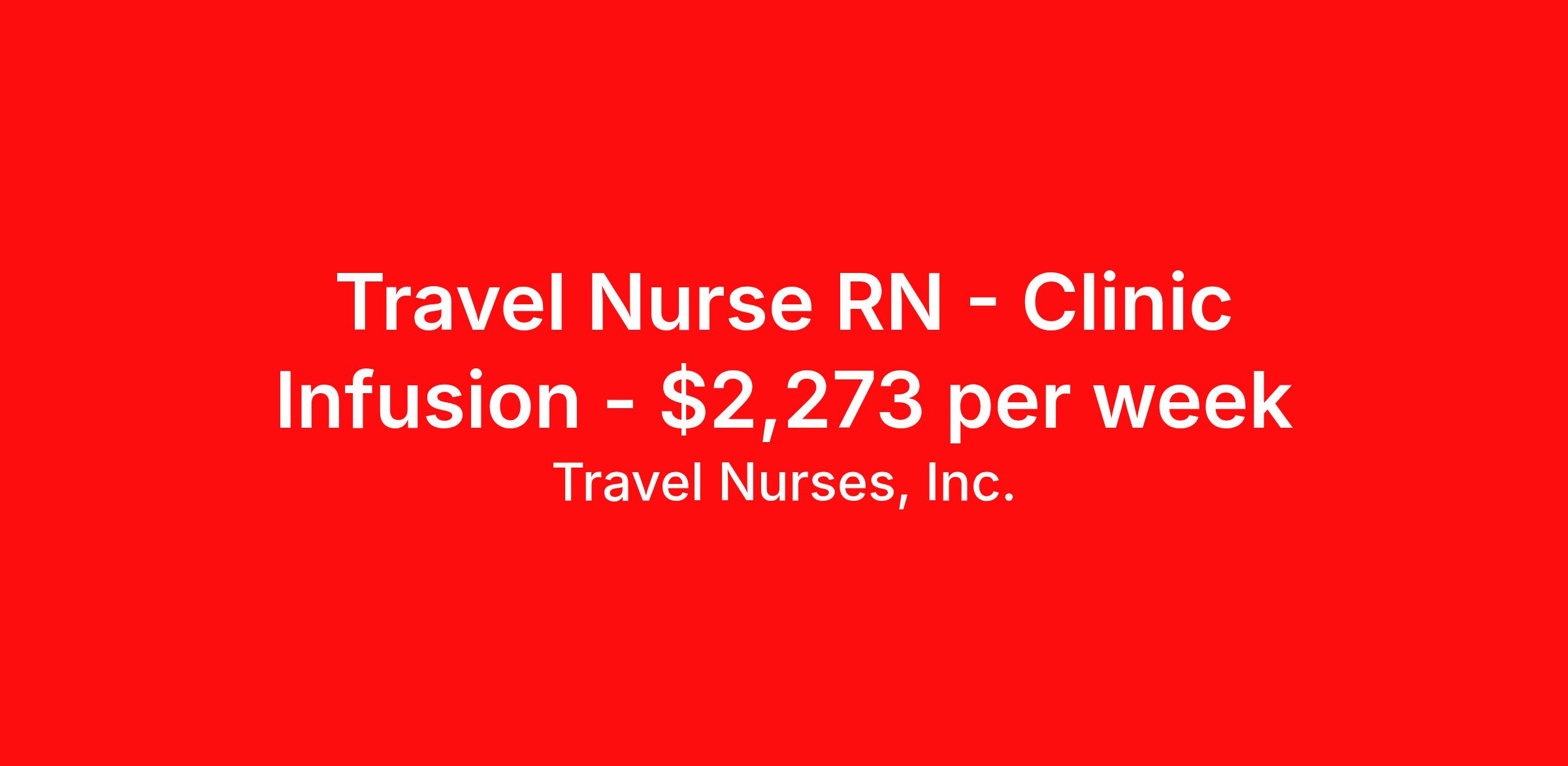 Travel Nurses, Inc. is seeking a travel nurse RN Clinic Infusion for a travel nursing job in Richmond, Virginia. Job Description & Requirements Specialty: Infusion Discipline: RN Start Date: 04/13/2026 Duration: 13 weeks 40 hours per week Shift: 8 hours Employment Type: Travel Travel Nurses, Inc. Job ID 309358. Pay package is based on 8 hour shifts and 40 hours per week (subject to confirmation) with tax-free stipend amount to be determined. Posted job title: Outpatient Clinic Infusion Registered Nurse About Travel Nurses, Inc. Travel Nurses, Inc. is a leading healthcare staffing agency that provides healthcare professionals with opportunities to work across the country. Founded by nurses in 1988, TNI has more than 30 years of experience in the industry. The agency initially focused on staffing operating room settings in the MidSouth. However, this quickly evolved to encompass all nursing specialties and allied health fields nationwide. At the heart of our mission is a profound respect for nurses, whom we consider the cornerstone of healthcare. This acknowledgment extends beyond the nursing profession alone. Travel Nurses, Inc. now proudly embraces a wide array of healthcare professionals, recognizing their crucial roles in our collective mission. Travel Nurses, Inc. is dedicated to providing comprehensive support and opportunities that will help facilitate complete career mobility in the healthcare field. Our commitment to transparency ensures that all professionals, not just nurses, can confidently accept any assignment without financial uncertainties. We prioritize our professionals’ well-being with comprehensive benefits packages, including day-one healthcare coverage, competitive salaries, bonuses and incentives. This underscores our unwavering commitment to offering the best possible rewards and support for all the professionals we serve. Benefits Weekly pay Continuing Education 401k retirement plan Wellness and fitness programs Mileage reimbursement Referral bonus Employee assistance programs Medical benefits Dental benefits Vision benefits Benefits start day 1 License and certification reimbursement Life insurance Retention bonus