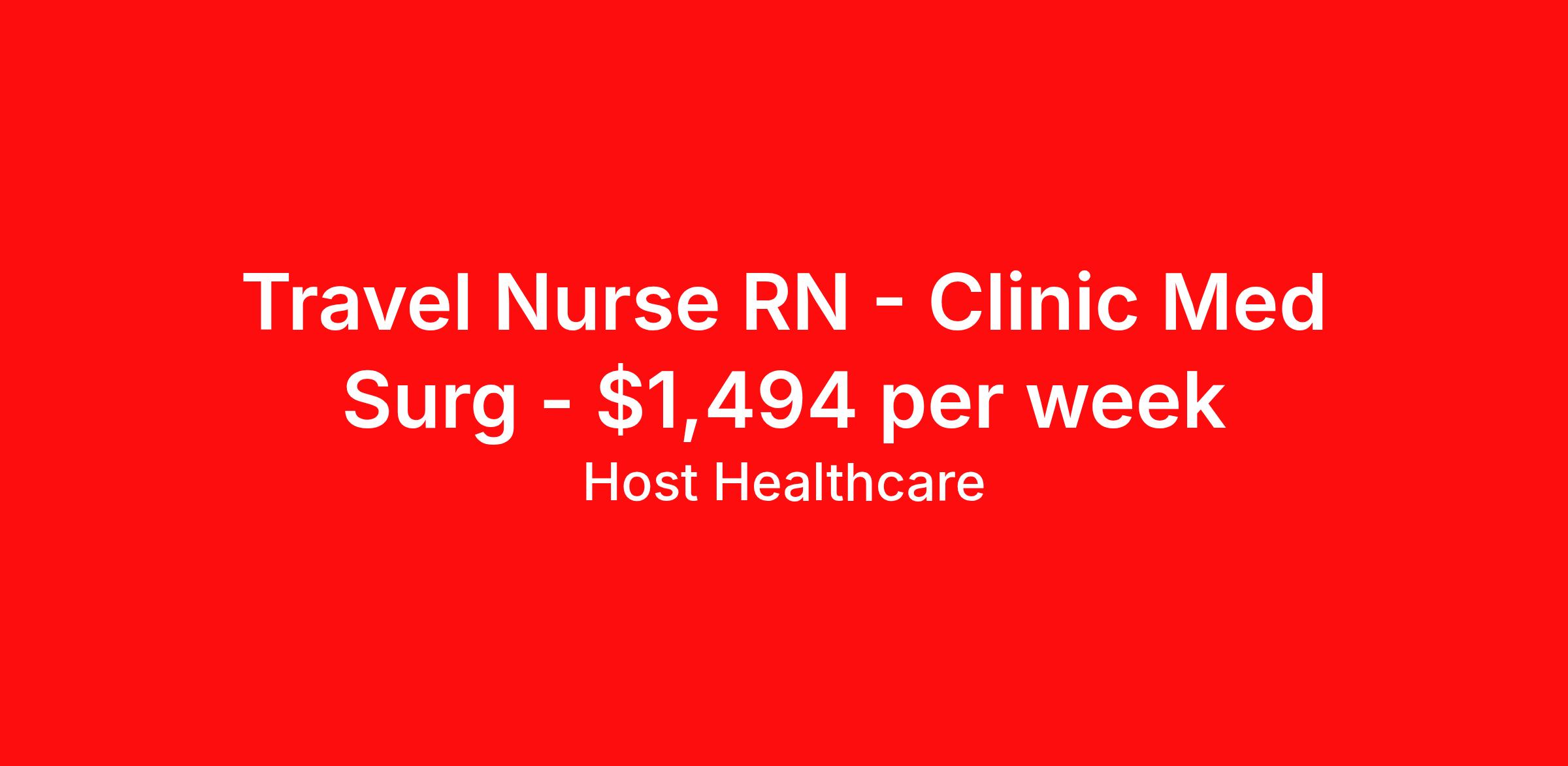 Host Healthcare is seeking a travel nurse RN Clinic Med Surg for a travel nursing job in Philadelphia, Pennsylvania. Job Description & Requirements Specialty: Med Surg Discipline: RN Start Date: 04/06/2026 Duration: 13 weeks 40 hours per week Shift: 8 hours, days Employment Type: Travel Host Healthcare Job ID a1fVX000002yPtdYAE. Pay package is based on 8 hour shifts and 40 hours per week (subject to confirmation) with tax-free stipend amount to be determined. Posted job title: RN - Clinic/Outpatient About Host Healthcare At Host Healthcare, we provide a truly comfortable experience as you explore your travel nursing, therapy, or allied career. We make your travel healthcare journey easy by taking care of all the details, so you don’t have to. We are on a mission to help others live better and we do this by helping the healers of the world be as comfortable as possible. With access to tens of thousands of travel nursing, therapy, and allied jobs in all 50 states, our responsive and friendly recruiters find your dream position based on what’s important to you. During your assignment, get access to premium benefits, including Day 1 medical that continues up to 30 days between assignments, 401K matching, travel reimbursements, dedicated housing support, and more. We also offer 24/7 support from our team and access to our on-staff clinicians so you can feel comfortable and confident throughout your entire assignment. Travel comfortably with Host Healthcare. Benefits Referral bonus School loan reimbursement Vision benefits Wellness and fitness programs Company provided housing options License and certification reimbursement Life insurance Medical benefits Mileage reimbursement Pet insurance Discount program Employee assistance programs Guaranteed Hours Health savings account Holiday Pay 401k retirement plan Continuing Education Dental benefits